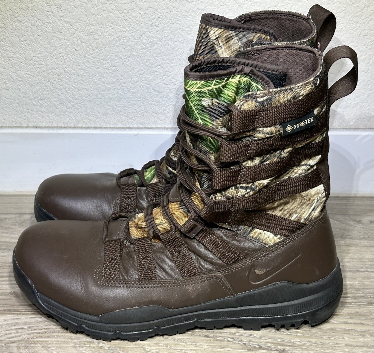 The Nike SFB Gen 2 8" Realtree Gore-Tex Brown Boots AJ9277-220 are designed for outdoor activities like hunting, hiking, and military use. These lace-up boots feature a high-top shoe shaft style with a solid brown color and leather upper material. The rubber outsole provides slip resistance and cushioning, making them lightweight and comfortable for all-day wear. Perfect for winter and fall seasons, these Nike SFB Gen 2 boots are a versatile option for outdoor enthusiasts looking for durable and reliable footwear.
