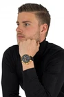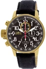 Gold tone stainless steel case 46mm diameter x 12.6mm thick; Black dial; Luminous hands and hour markers Japanese quartz movement. VD57 Caliber; Assembled in Japan; SR920SW battery; watch weight: 100 grams Black canvas band, 210mm L x 22mm W; Buckle clasp Mineral crystal; Push/pull crown; Stationary stainless steel bezel; Functional Subdials: 60min, 60sec, 1/10th sec; 100 meter water resistant: Suitable for recreational surfing, swimming, snorkeling, sailing and water sports. Not suitable for diving.