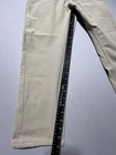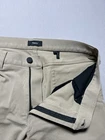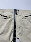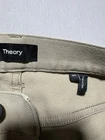 Men's Theory pants in size 33x25, beige color. Made of Spandex and Polyamide blend for stretch performance. Features a zip and button closure with a flat front design. Suitable for travel, casual, or business occasions. Styled as chino pants with a straight leg and 5-pocket design. Ideal for college, city, or preppy themes in all seasons.