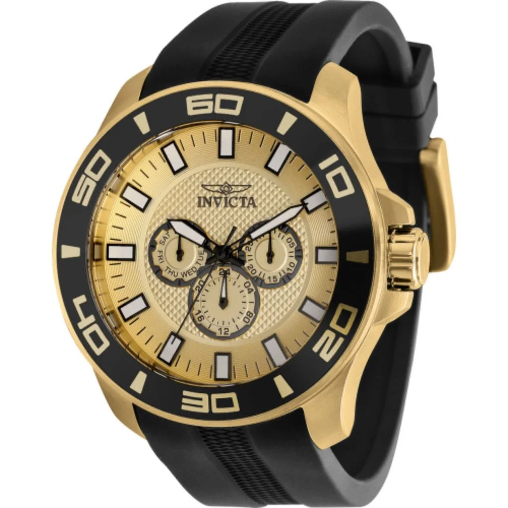 Plunge into any horizon using the steadfast guidance of the Invicta Pro Diver. Stylishly classic, internal workings are forged with variations of bold movements. Built with confident prowess, the fortitude with which these timepieces function makes the Pro Diver the quintessential in performance. Quartz movement 40mm stainless steel case, 12.5mm thick Two tone stainless steel band with foldover closure Band length and width: 180mm x 20mm Black dial Screw down crown Mineral crystal 200 meter water resistant
