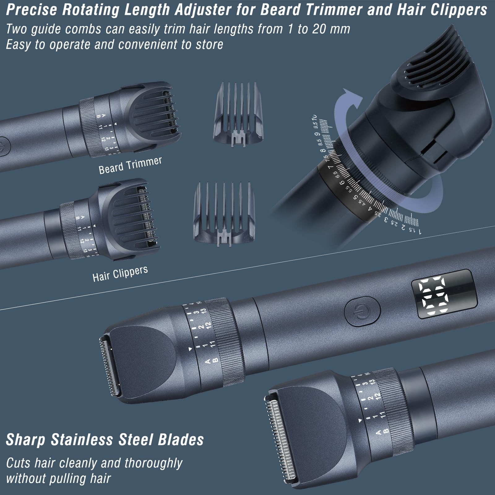 Beard Trimmer for Men Professional Electric Foil Shaver & Hair Clippers, 5-in-1 Mens Grooming Kit Body Shaver Groomer Waterproof Wet/Dry Nose Ear Mustache Hair Trimmer with Type-C Rechargeable Dock 5-in-1 Beard Trimmer Kit - A professional multifunctional grooming kit designed for men, a one-stop solution for men's beard, hairstyle, body hair and ear/nose hair trimming. The foil shaver can easily shave short hair or stubble to complete the zero finish of the face, head and body Precise & Adjustable Trimming Length - The hair clippers and beard trimmer are each equipped with two comb guides, which can be easily switched between various trimming lengths (1-20mm) through the rotary regulator. It is simple and easy to operate, reliable and durable, allowing you to easily complete the ideal hairstyle shaping Powerful and Durable - The men's all-in-one hair trimmer kit equipped with an upgraded high-speed motor to provide strong power, with the sharp stainless steel cutter heads, it can trim hair accurately and cleanly without any pulling of hair Waterproof Wet & Dry - The professional hair trimmer clippers kit is 100% waterproof and washable, you can shave/trim dry or wet or even use it in the shower. After use, you can rinse it under running water for quick cleaning USB-C Charge Dock - You can charge the trimmer kit directly by connecting it to the USB-C cable, or place it on the dock to charge. It can be fully charged in 1.5 hours and can be used for up to 100 minutes. Note: The trimmer kit only supports DC 5V 1A charging power. Please only use the included USB-C cable to charge the machine. Do not charge the machine with a charger with a power of DC 5V 3A or above (such as an iPhone charger). What's included in the package - a hair clippers, a beard trimmer head, a foil shaver head, a body hair trimmer head, a nose hair trimmer head, 4 comb guides, a dock, a USB-C charging cable, a cleaning brush, and an instruction manual