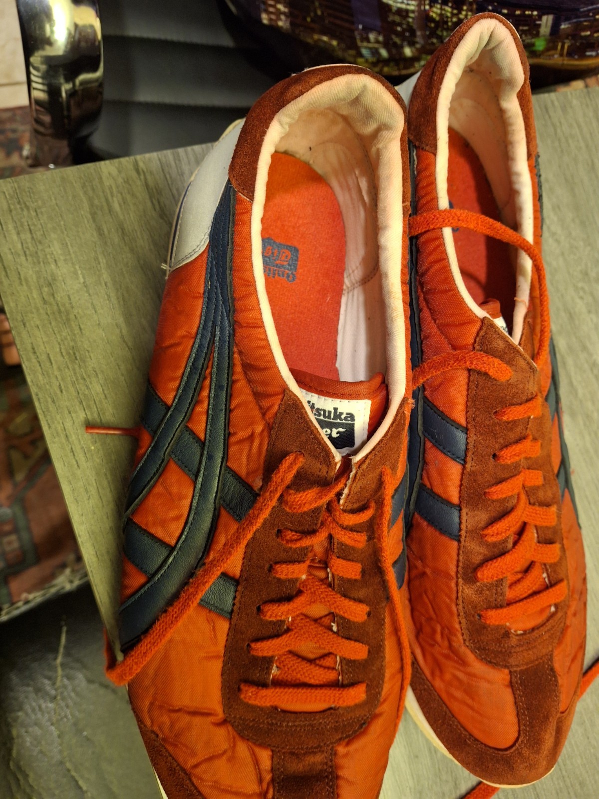 The product is a pair of Men's ASICS sneakers in size 11.5, featuring a vintage style with stripes. These athletic shoes are designed in a classic red color with a standard shoe width, making them comfortable and stylish for everyday wear. The ASICS Onitsuka Tiger model combines retro design with modern functionality, perfect for men who appreciate both fashion and performance.