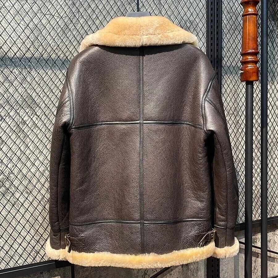Stay warm in style with our Men’s B3 Aviator Shearling Leather Jacket , expertly crafted from 100% real sheepskin leather with a luxurious genuine shearling wool lining . Inspired by classic WWII bomber jackets, this timeless outerwear piece combines rugged charm with premium comfort, ideal for winter and outdoor wear. Features: ✅ Material : Exterior made from premium real sheepskin leather ✅ Lining : Fully lined with soft and thick natural shearling wool ✅ Design : Classic B3 bomber style with a turn-down fur collar ✅ Zipper Closure : Durable front zipper with side pockets ✅ Warm & Windproof : Perfect for cold temperatures and harsh weather ✅ Color : Deep brown with cream shearling ✅ Fit : Regular fit, designed for comfort and layering Occasions: Ideal for casual winter wear, riding, vintage fashion lovers, and outdoor adventures. Available Sizes: S, M, L, XL, 2XL, 3XL (See size chart in images or message for guidance) 📦 Item Details: Condition: New with tags Style: Flight Bomber Jacket Type: Jacket Season: Winter Country of Manufacture: Pakistan (handcrafted with care) Closure: Zipper Collar: Faux Fur / Shearling Material: Sheepskin Leather Lining Material: Real Shearling Wool B3 Shearling Jacket Aviator Leather Jacket Bomber Coat Men's WWII Pilot Jacket Sheepskin Winter Jacket Real Leather Jacket Men's Warm Fur Jacket Flight Bomber Coat Vintage Pilot Jacket Winter Shearling Coat