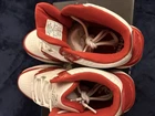 Elevate your game on the court with these mid-top Shaq Devastator sneakers in a striking red and white colorway. With a cushioned insole and fabric lining, these athletic shoes provide both comfort and support during intense basketball gameplay. The rubber outsole offers superior traction on the court, while the faux leather upper adds a touch of style to your overall look. These sneakers are perfect for any active man, whether you're playing basketball or simply running errands. The lace-up closure ensures a secure fit, while the striped pattern adds a classic touch to your outfit. Don't miss out on the opportunity to own these high-performance, stylish sneakers.