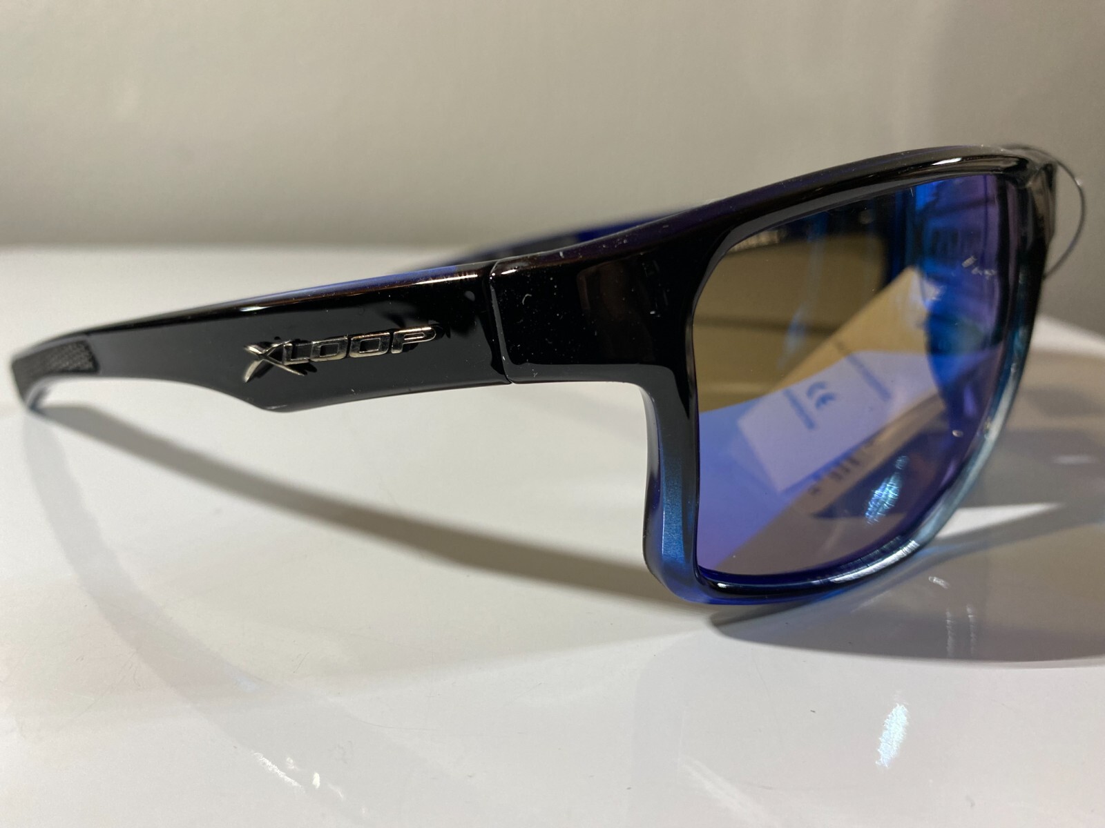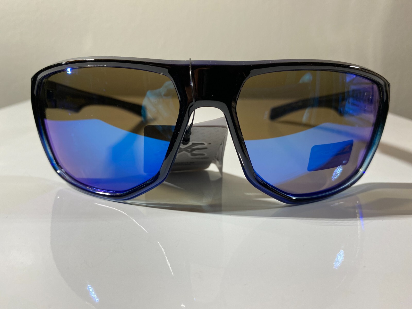Men's wrap around sunglasses with black frame and blue reflective lenses. Great price.