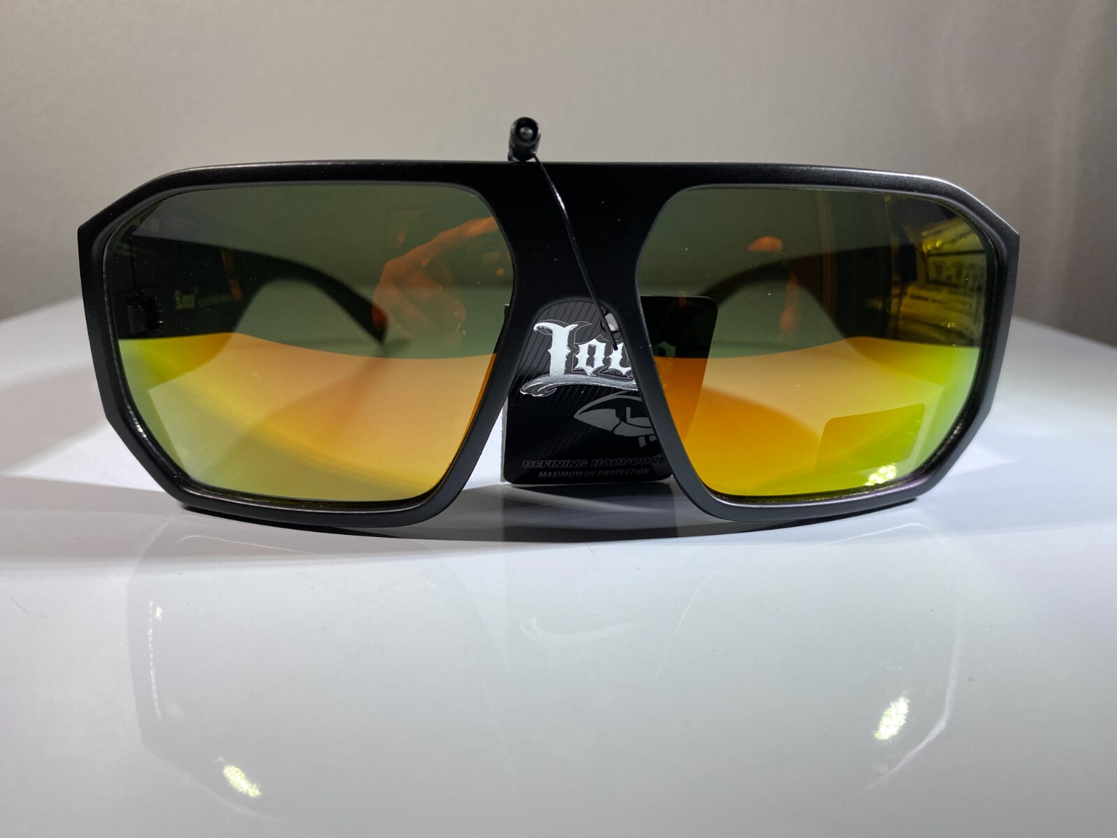 men's hexagonal shaped sunglasses with black frame and yellow reflective lenses. Great style at great price.