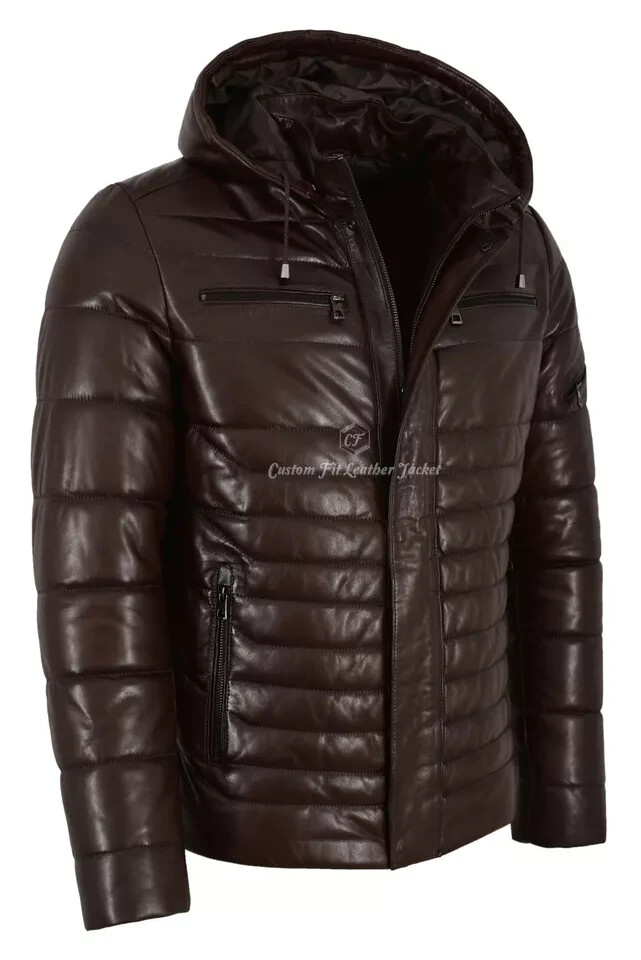 Men's Brown Napa Lambskin Quilted Puffer Hooded Leather Jacket