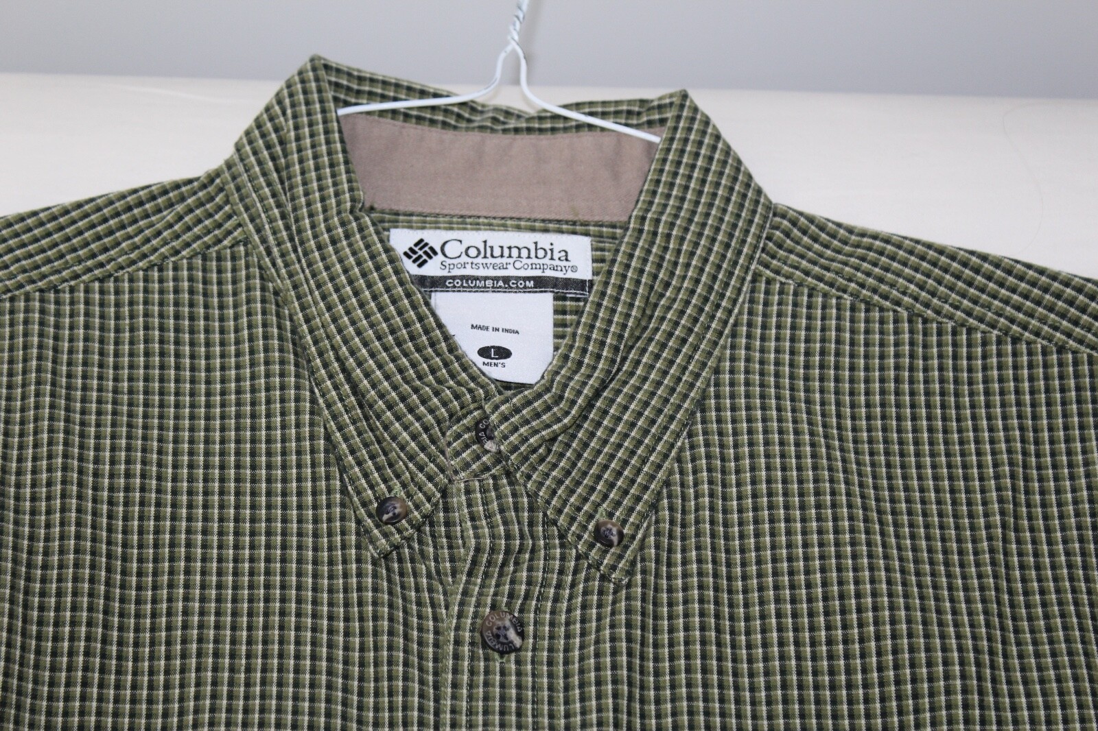 Mens COLUMBIA Long Sleeve Button Down - Size Large 100% cotton Chest pocket with Columbia label Green and khaki check pattern Adjustable button sleeve cuffs. Smoke and pet free home.
