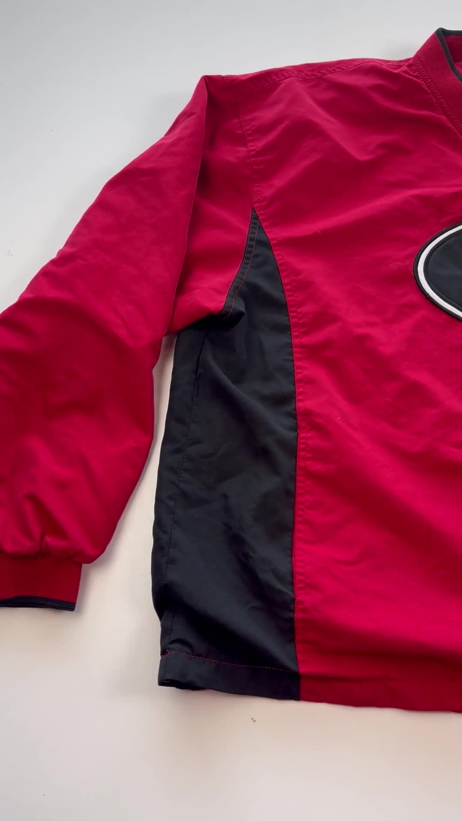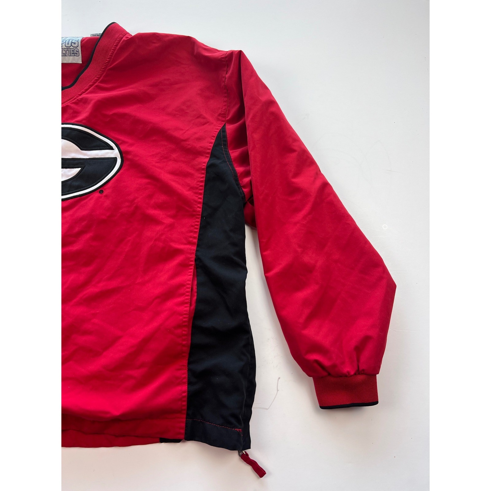 Show your Georgia Bulldogs pride with this vibrant red and black pullover jacket from Campus Specialties. The iconic interlocking G logo boldly displayed on the chest makes a statement of unwavering team spirit. Designed for comfort and style, this jacket features a classic V-neck collar and elasticized cuffs for a secure fit. The side panels in contrasting black add a dynamic visual element, while the lightweight construction makes it perfect for game days, casual outings, or cheering on your favorite team from the stands. Style: Windbreaker Department: Unisex Adults Outer Shell Material: Polyester Product Line: Campus Specialties Performance/Activity: Football Features: Water Repellent Type: Jacket Closure: Pullover Theme: College Fabric Type: Woven Keywords: Georgia Bulldogs, NCAA, College Football, Gameday, Pullover, Windbreaker, Athletic, Sportswear, Team Apparel, Fan Gear, Comfortable, Casual Wear, Outdoor, Spirit Wear