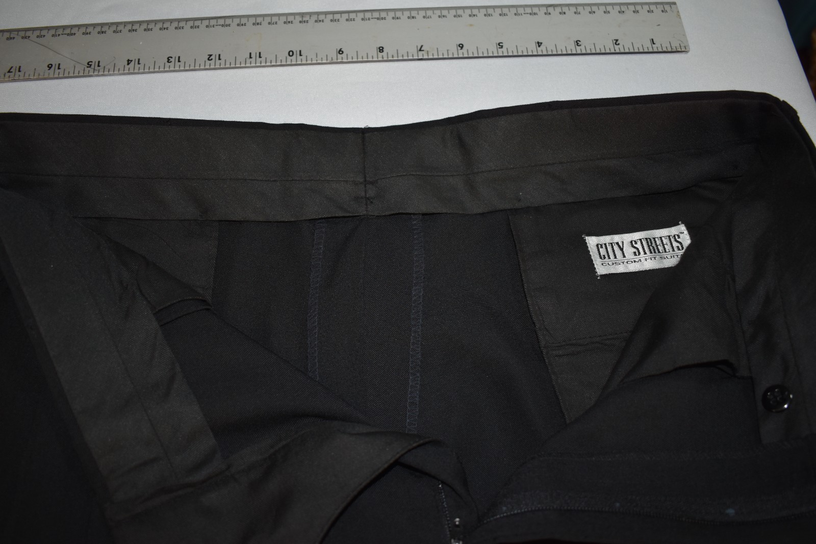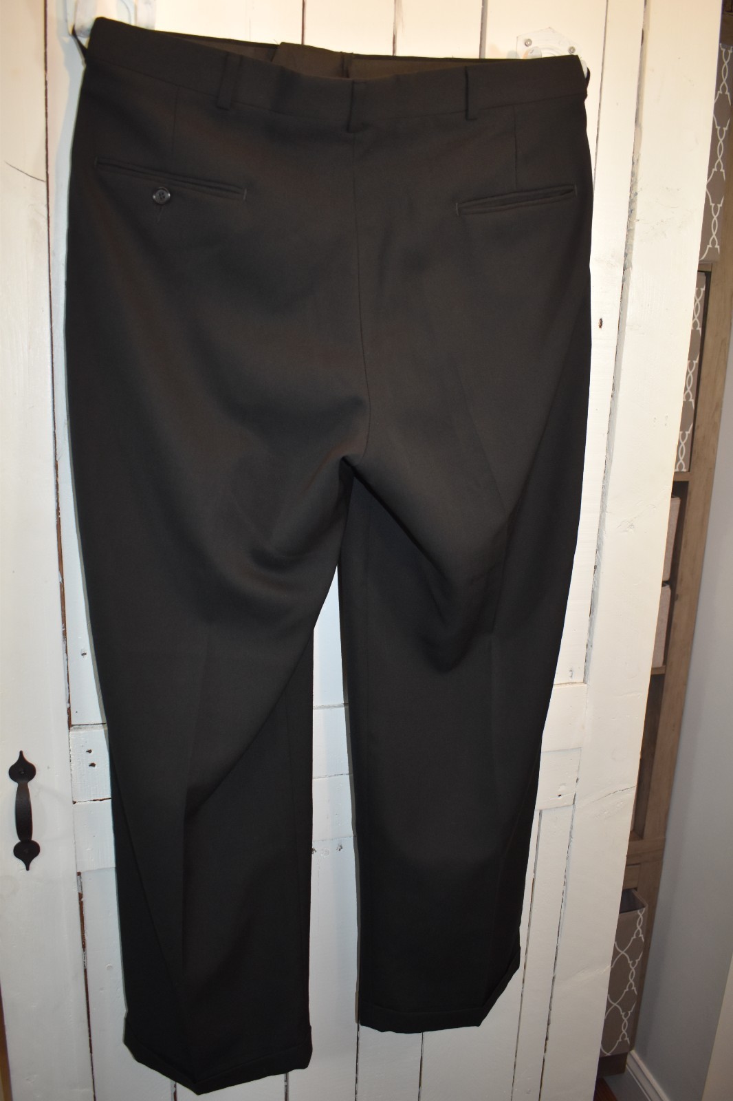 The Men's City Streets Custom Fit Black Dress Pants are a sleek and stylish option for formal and business occasions. Made from a blend of 65% poly and 35% wool, these pants feature a solid black color and a straight leg style with a pleated front. The pants have a zip, button, and hook & eye closure, two side front pockets, and one back pocket with a button. The size 34 waist and 30 inseam offer a comfortable and tailored fit, while the cuffed feature adds a sophisticated touch to the dress pants from City Streets. I measure the waist and inseam to check the tag and report that here and in my photos. These pants measure a 34 inches waist. These pants measure a 30 inches inseam.