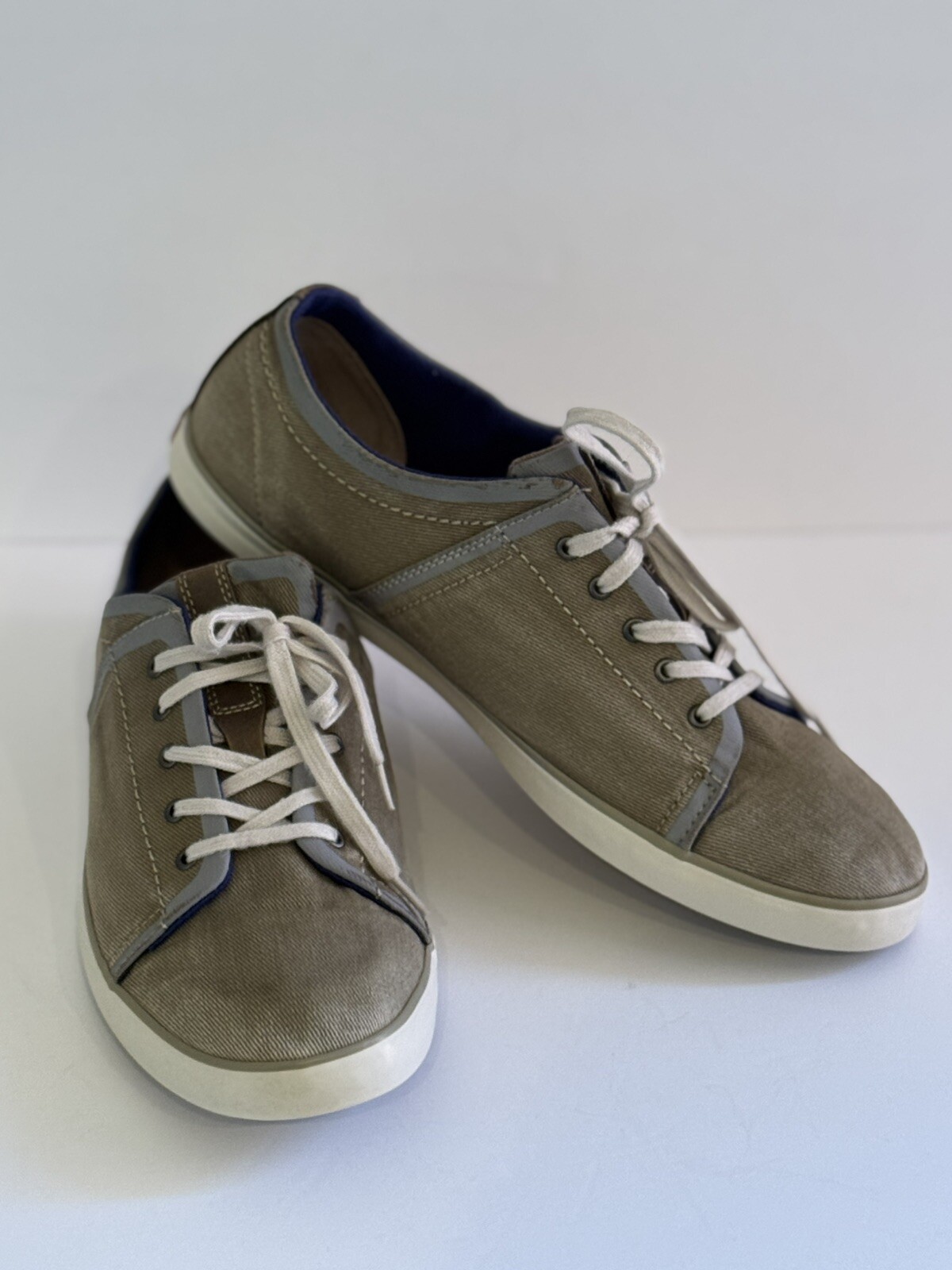 These men's Clarks sneakers in size 11 feature a solid tan color with a round toe and lace-up closure. They are designed for activewear, casual wear, or workwear, offering comfort with Clarks Soft Cushion technology. The sneakers have a slight fading on the toe area, as shown in the pictures provided, making them suitable for daily use as work shoes. Made in Vietnam, these sneakers are a versatile and stylish option for men seeking both comfort and functionality in their footwear.