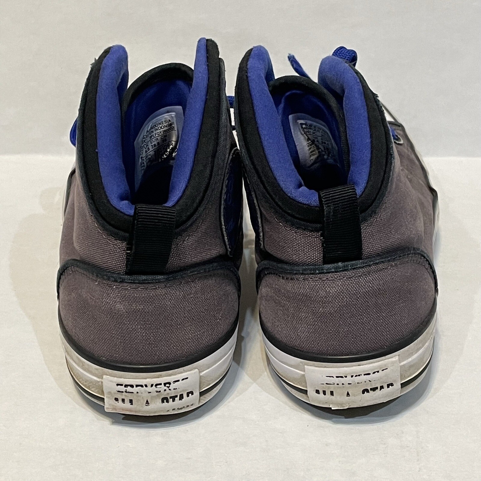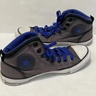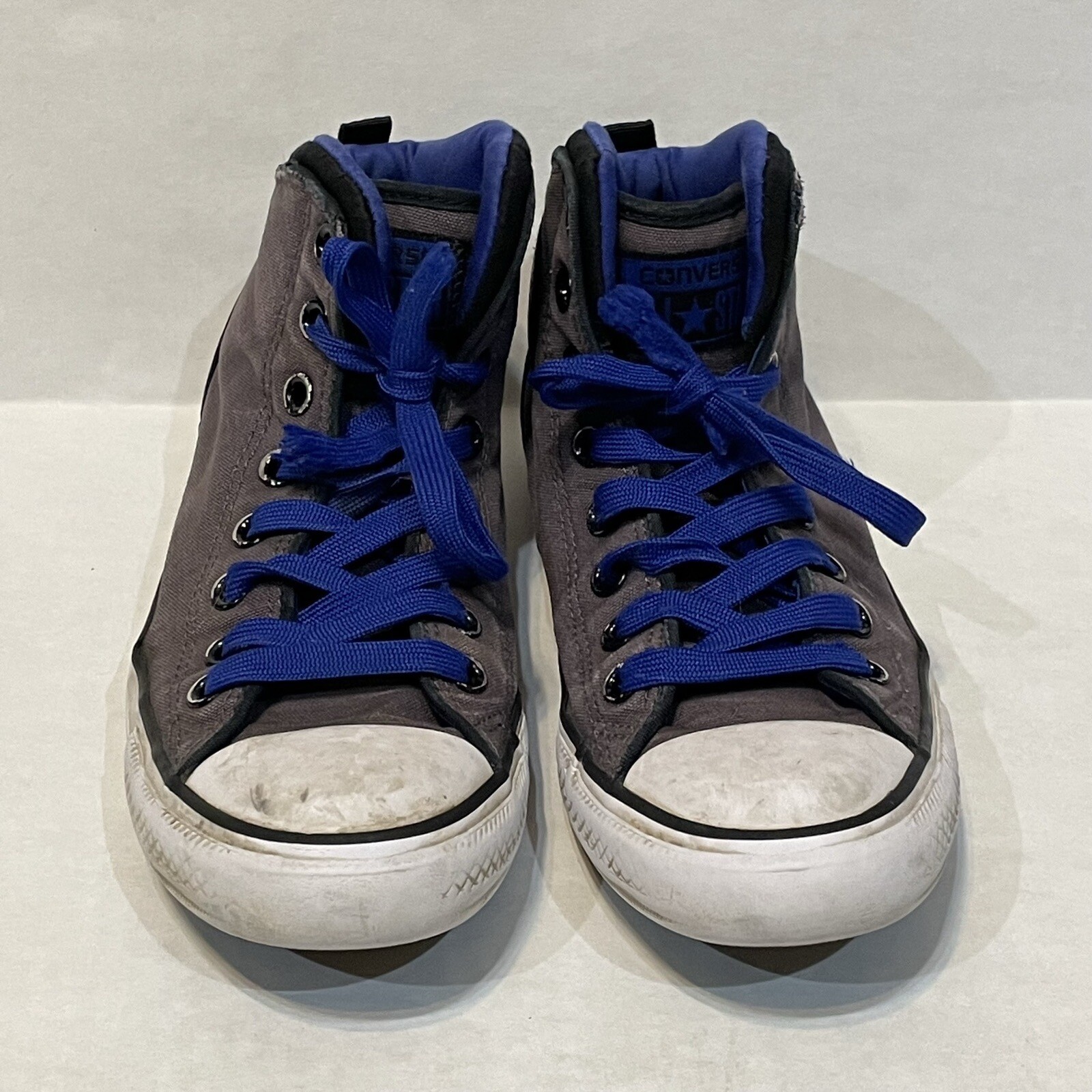 This pair of Converse Chuck Taylor All Star sneakers is the perfect addition to any casual outfit. The high-top grey canvas shoes feature a lace-up closure for a secure fit and the iconic Chuck Taylor logo on the side. Needs new laces.