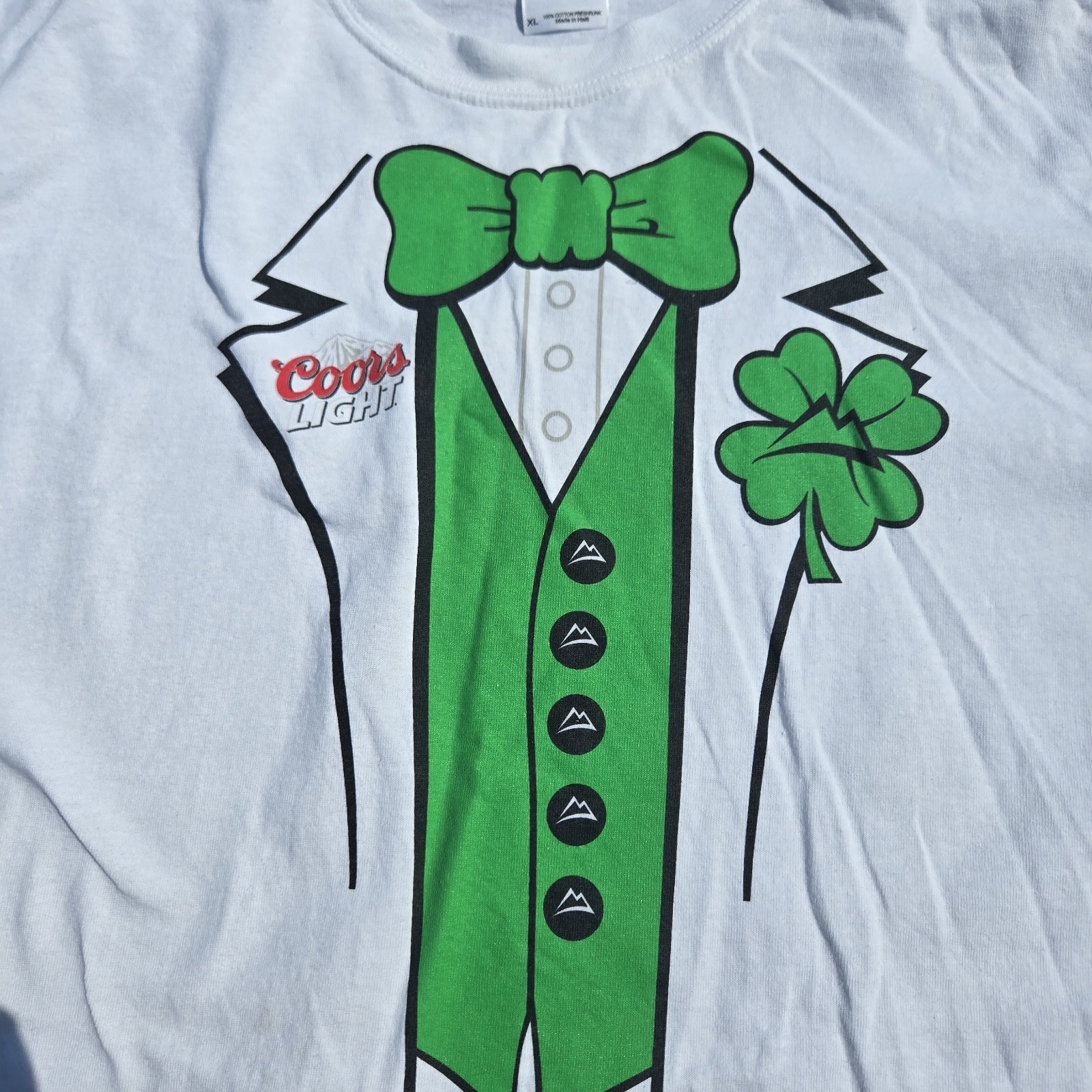 This Men's Delta XL Coors Light Beer Tuxedo St. Patrick's Day T Shirt is a double-sided, green shirt made of cotton, featuring a beer theme perfect for St. Patrick's Day. The short sleeve shirt has a regular fit and is machine washable, making it easy to care for. With its unique design and XL size, this T-shirt is a great addition to any man's wardrobe, suitable for wearing in spring, summer, or fall. Made in Honduras, this shirt is a stylish choice for beer enthusiasts looking to show off their love for Coors Light in a fun and festive way.