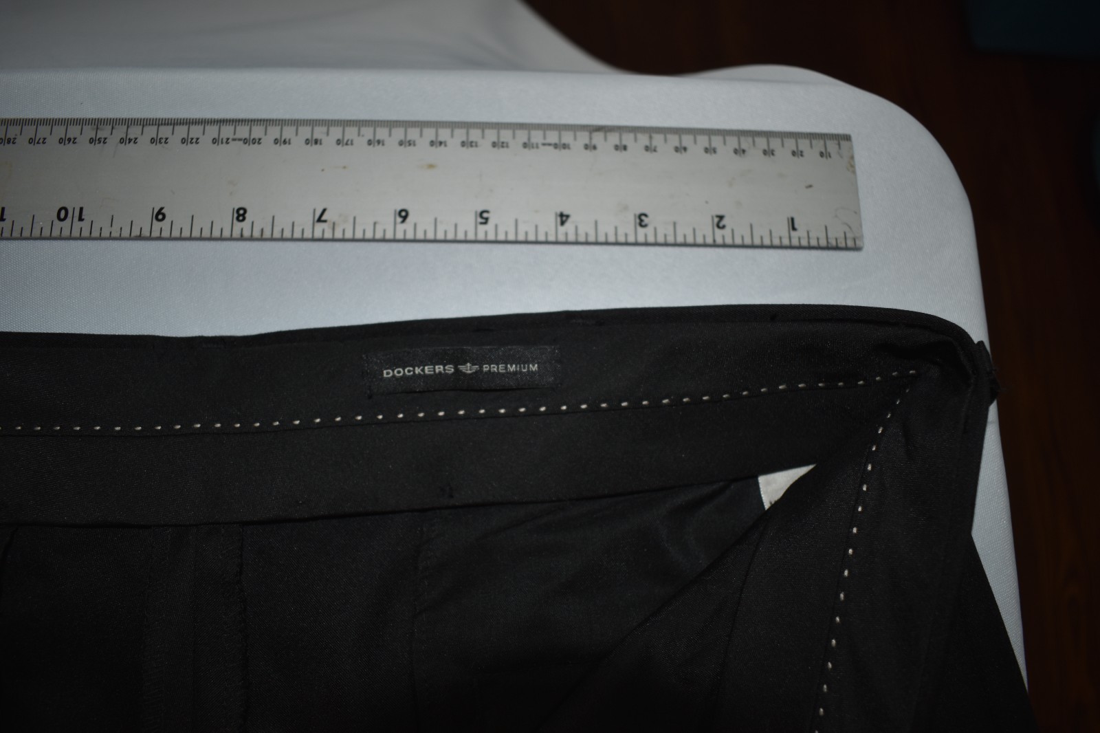 The Men's Dockers Relaxed Dress Black Pants in size 34w x 30l are a stylish and versatile option for men's formal wear. Made from 100% polyester, these pants feature a solid black color with a zip and two button closure for a clean and sophisticated look. The relaxed fit and straight leg style offer comfort and a modern silhouette, perfect for professional or formal occasions. With two side front pockets and two back pockets with buttons, these pants provide both style and functionality. The Dockers Premium Relaxed Fit product line ensures high quality and durability, making these pants a great addition to any man's wardrobe. I measure the waist and inseam to check the tag and report that here and in my photos. These pants measure a 34 inches waist which agrees with the tag. These pants measure a 30 inches inseam which agrees with the tag.