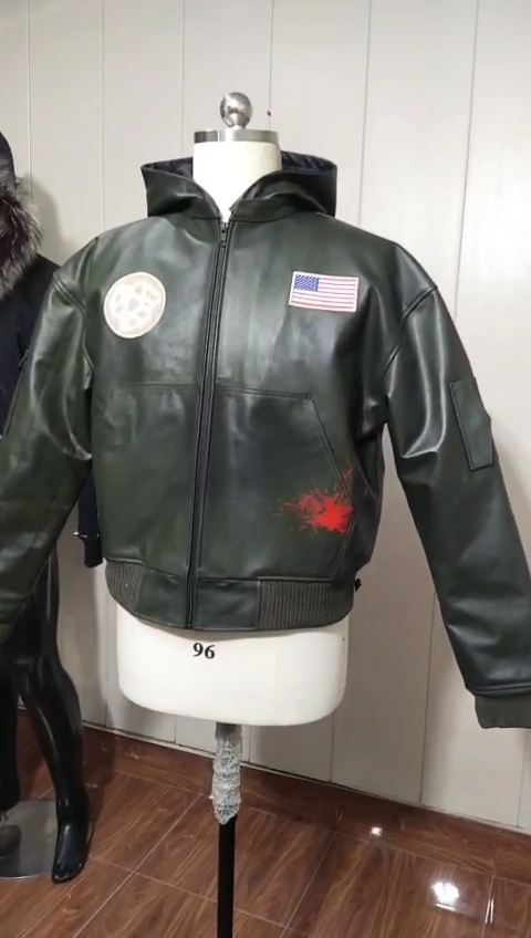 Men's Military Green Leather Hoodie Jacket – American Flag & Tactical Patches Step into bold style with this rugged Men's Military Green Leather Jacket designed for the modern rebel. Crafted from high-quality Cowhide leather with a sleek satin sheen, this jacket delivers comfort, durability, and edge. The standout details include: > 🧥 Material : Premium Cowhide leather with inner soft lining for all-season wear. > US Design : Features a U.S. flag patch and unique tactical-inspired emblem on the chest. > 🔥 Details : Red splatter design on the lower side adds a daring, battle-worn aesthetic. > 👕 Fit : Regular fit with ribbed cuffs and hem for a secure, stylish silhouette. > 🧢 Extras : Attached hood for extra protection and street-style appeal, You can Detach the Hood if you want. > 🎯 Pockets : Functional sleeve pocket & front side entry pockets. Perfect for casual streetwear, cosplay, or statement fashion, this jacket is made for those who stand out and speak loud through their style. For Custom Size Orders Check Personalize Option to send your Requirements.