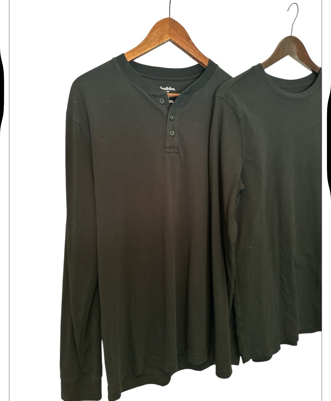 Men’s Goodfellow Long sleeved Black 2 shirts bundle, medium Very gently loved, great condition. 2 long sleeved Black Goodfellow t shirts in cotton and cotton blend. One shirt has 3 buttons, and the other is everywhere tee shirt, both black size medium. Approx measurements 3 button shirt PTP 21” Shoulder to bottom 28” Everywhere Tee PTP 18” Shoulder to bottom 28”