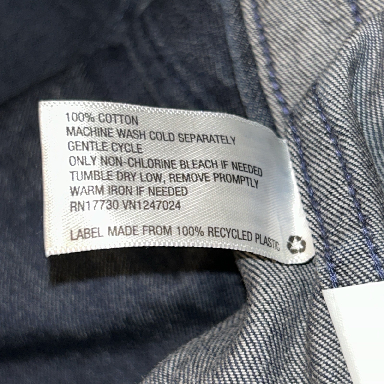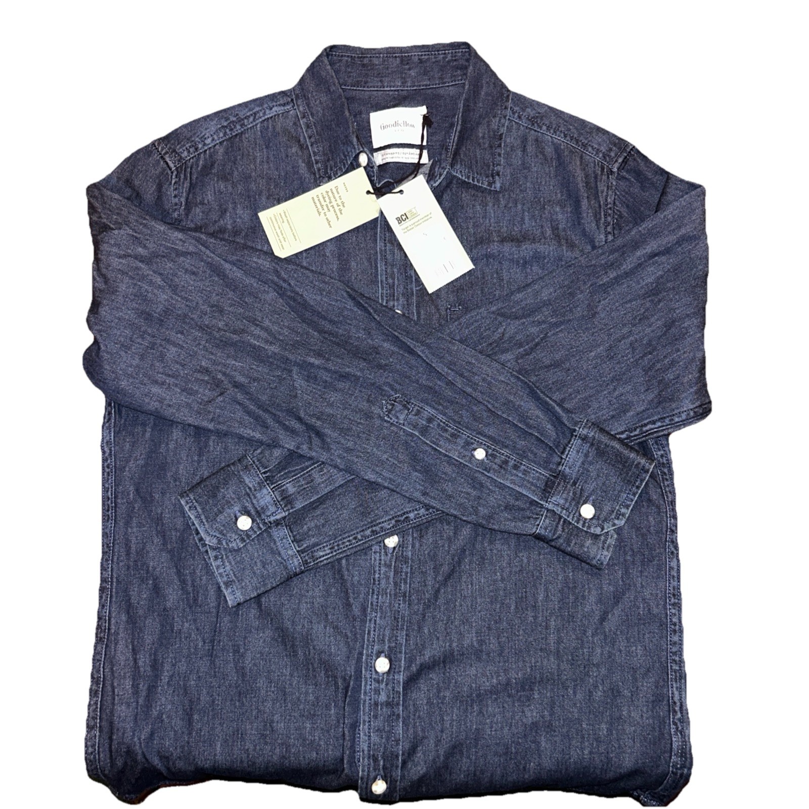 Pit to pit 19”, length 29”. The Men's Goodfellow Denim Shirt in size small is a classic and versatile addition to any man's wardrobe. Made from durable cotton denim fabric, this dark night blue shirt features a solid pattern, long sleeves, and a collared neckline with a button closure. With a regular fit and 38-inch chest size, this button-up shirt from Goodfellow is perfect for everyday wear and can be easily machine washed for convenience. Perfect for casual occasions, this shirt embodies timeless style and quality craftsmanship.