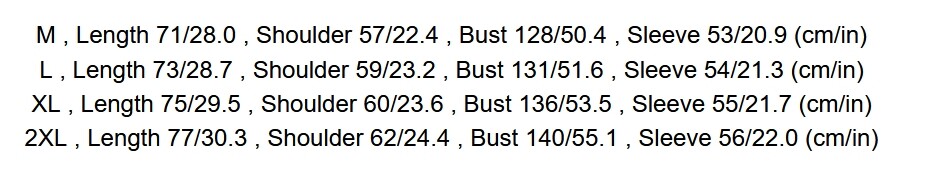 Store category Sign Up Now ! You may also like Product Description Please note this is in Asian sizing, smaller than western size e.g. UK, US, AU. Please check the measurements carefully before making a purchase. Please allow 1 inch discrepancy due to different measurement method. If you are not sure which size to buy, please provide height and weight, we will recommend a suitable size. Photos may slightly different from actual item's color due to the lighting during photo shooting or the monitor's display. This item is for one top only and excludes all the accessories. Material: cotton M , Length 71/28.0 , Shoulder 57/22.4 , Bust 128/50.4 , Sleeve 53/20.9 (cm/in) L , Length 73/28.7 , Shoulder 59/23.2 , Bust 131/51.6 , Sleeve 54/21.3 (cm/in) XL , Length 75/29.5 , Shoulder 60/23.6 , Bust 136/53.5 , Sleeve 55/21.7 (cm/in) 2XL , Length 77/30.3 , Shoulder 62/24.4 , Bust 140/55.1 , Sleeve 56/22.0 (cm/in) Color: multi-color Payment Delivery details Terms of sales About us Contact us Payment Accept all payment. We send all the items are based on your paypal address. Therefore, please make sure your paypal address is valid. Delivery details We will arrange shipping for you within 10 days after payment cleared except the holidays Hi ,Great buyer : I will send it out as soon as possible. The company has many stores. Send in order of order. Processing time: 2-4 days. The system automatically uploads tracking numbers. Transportation time: 8-12 working days.(Europe and North America and Australia) Transportation time in the Middle East region and Northern Europe : 10-15 days. Asian transportation time: 5-10 days African transportation time: 30-40 days. Transportation time in South America: 30-40 days Please understand. Wishing you a pleasant shopping experience. . Terms of sales It's highly appreciated you leave us positive feedback and 5 star rating comments if you are satisfied with our service ! Your comment is very important in our business success. About us In China we have our own factory, we support a large number of wholesale and customized, price concessions. And we can achieve long-term cooperation. Provide products for your store. Contact us Our team is with the collection of research, production, distribution and service, Expect in the goods quality be still on the price, after-sales service, we all will keep in the middle of go together of advantage position, real attain the ream customer satisfaction. Feedback