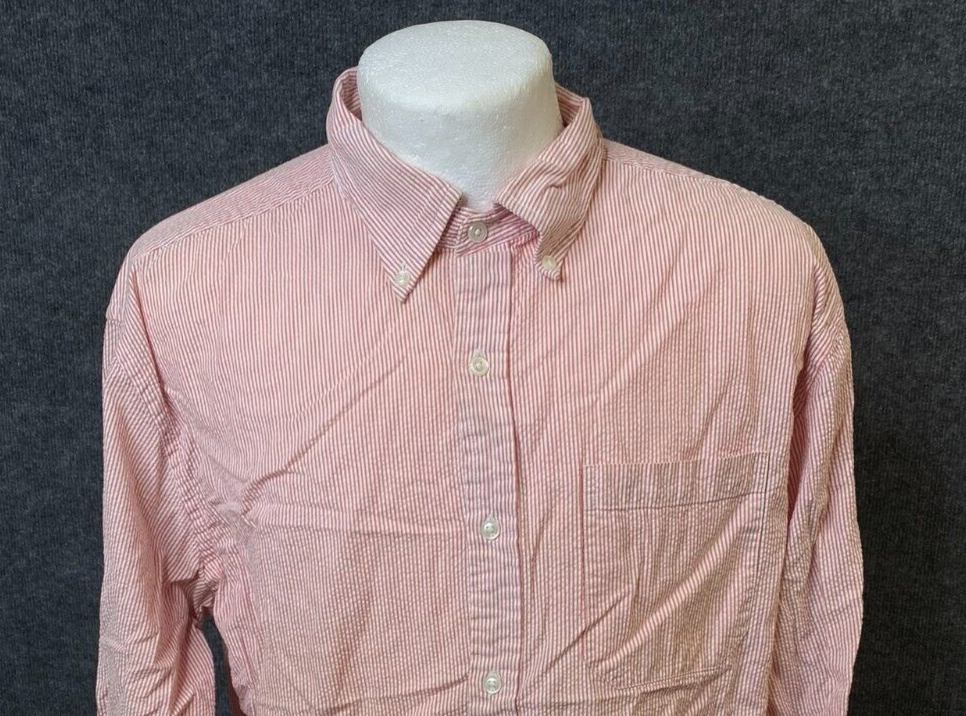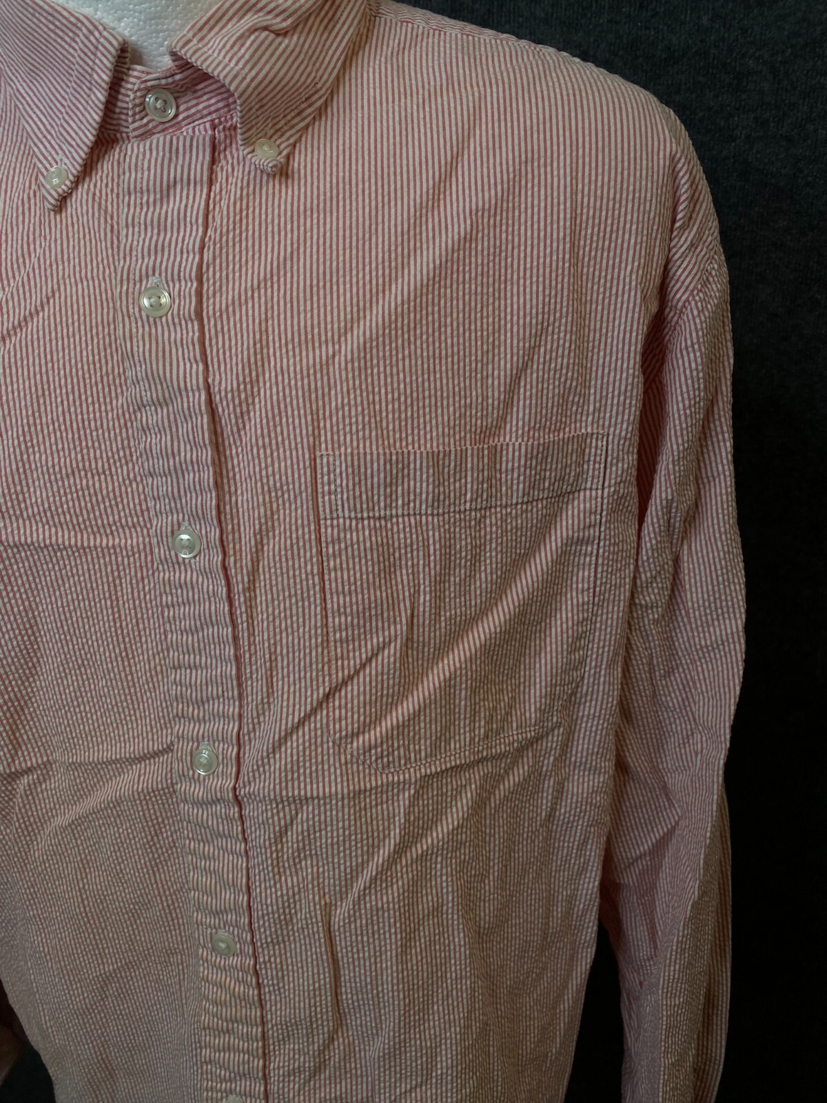 LL Bean Traditional Shirt Sz L Large Men's Pink White Striped Casual Button Down Color: Pink White Stripes Armpit to Armpit Measures: 25" Material: 100% Cotton In Very Good Condition, Needs Pressing Please refer to photos SKU# 4932