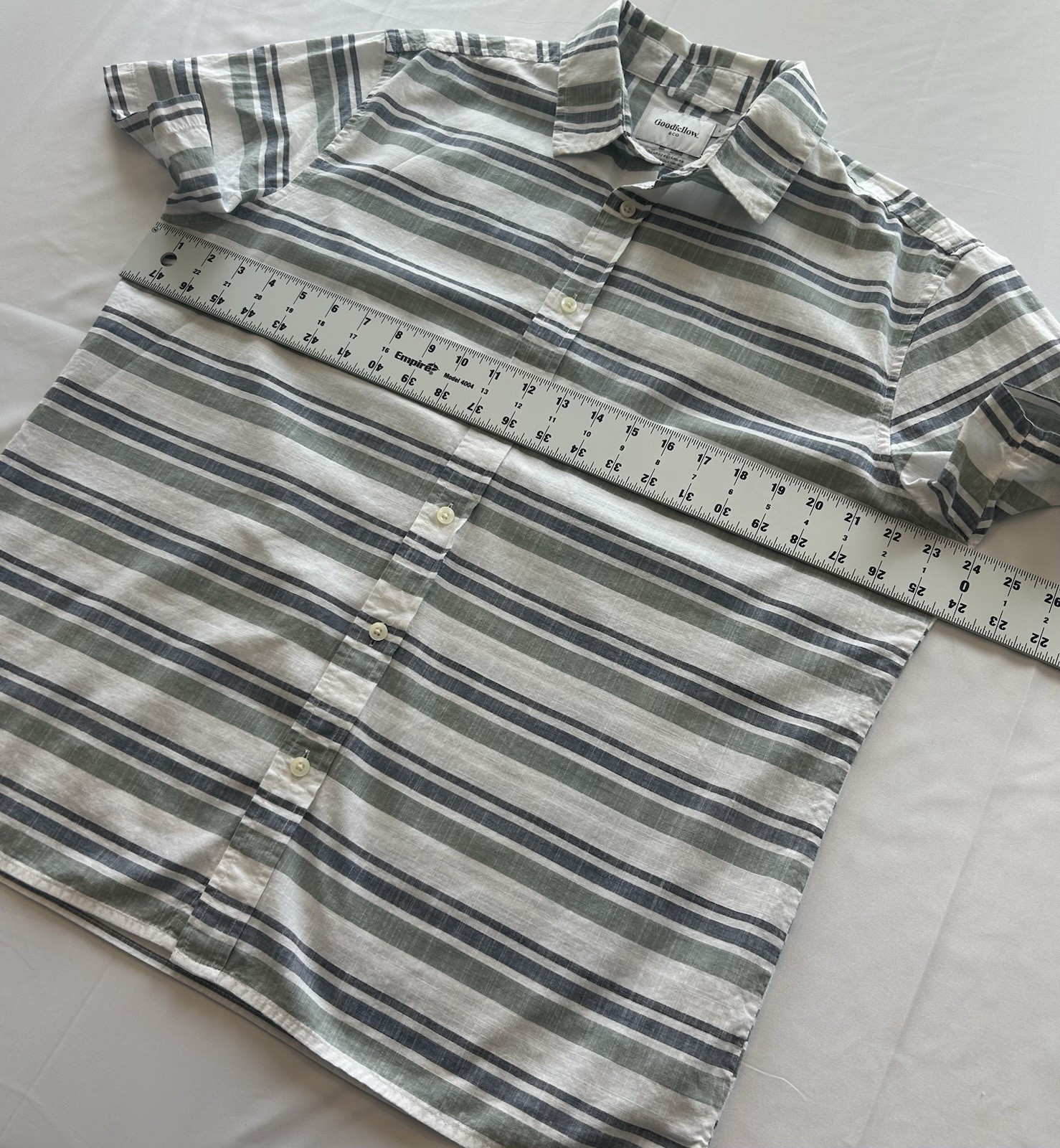 The product is a men's size L short sleeve button-up cotton shirt from Goodfellow & Co. It features a regular fit, button closure, and is made from cotton fabric. The shirt is designed in a multicolor pattern, making it suitable for casual wear.