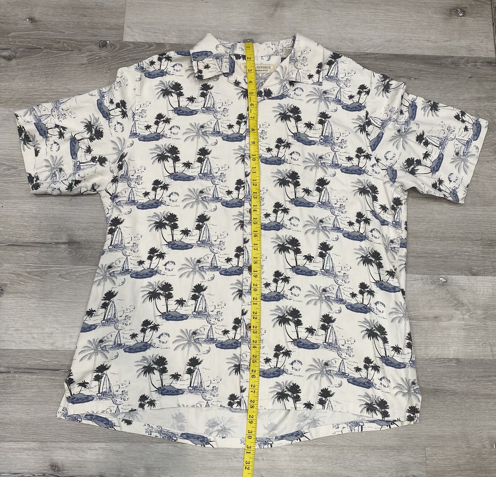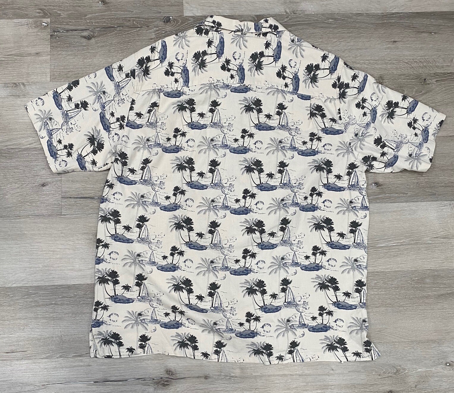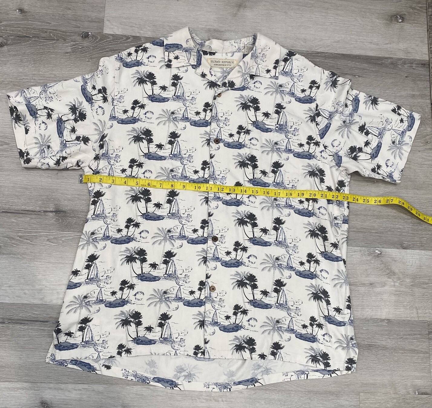 Get ready to embrace the tropical vibes with this Island Republic button-up shirt. The shirt features a palm tree/island pattern in a cream/blue color scheme, perfect for a casual occasion. The short-sleeved shirt is made of lightweight silk material, making it comfortable to wear in summer, fall, or spring. The shirt has a collared neckline with a point collar style and a regular fit, suitable for a comfortable wear. It also includes a front pocket for convenience. The shirt is machine washable and has a button closure. This Hawaiian and tropical-themed shirt is perfect for any man who wants to add a touch of island to their wardrobe.