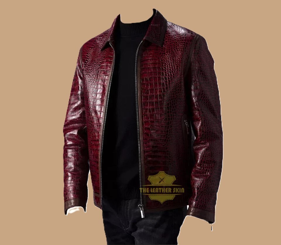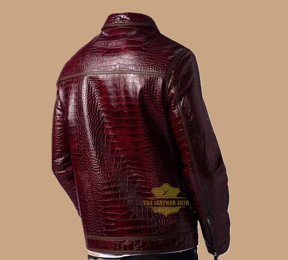 This Men's Leather Jacket in Burgundy with a Crocodile Pattern is a luxurious addition to any wardrobe. Handmade with real leather, it features a stylish motorcycle jacket design with a mid-length cut, full zip closure, and zipped pockets for convenience. The jacket is perfect for all seasons and can be worn for various occasions including casual outings, formal events, travel, and more. With a relaxed fit and a chest size range of 32-48, this high-quality leather jacket from The Leather Skin brand is a must-have for any fashion-conscious man who appreciates a touch of sophistication and style.