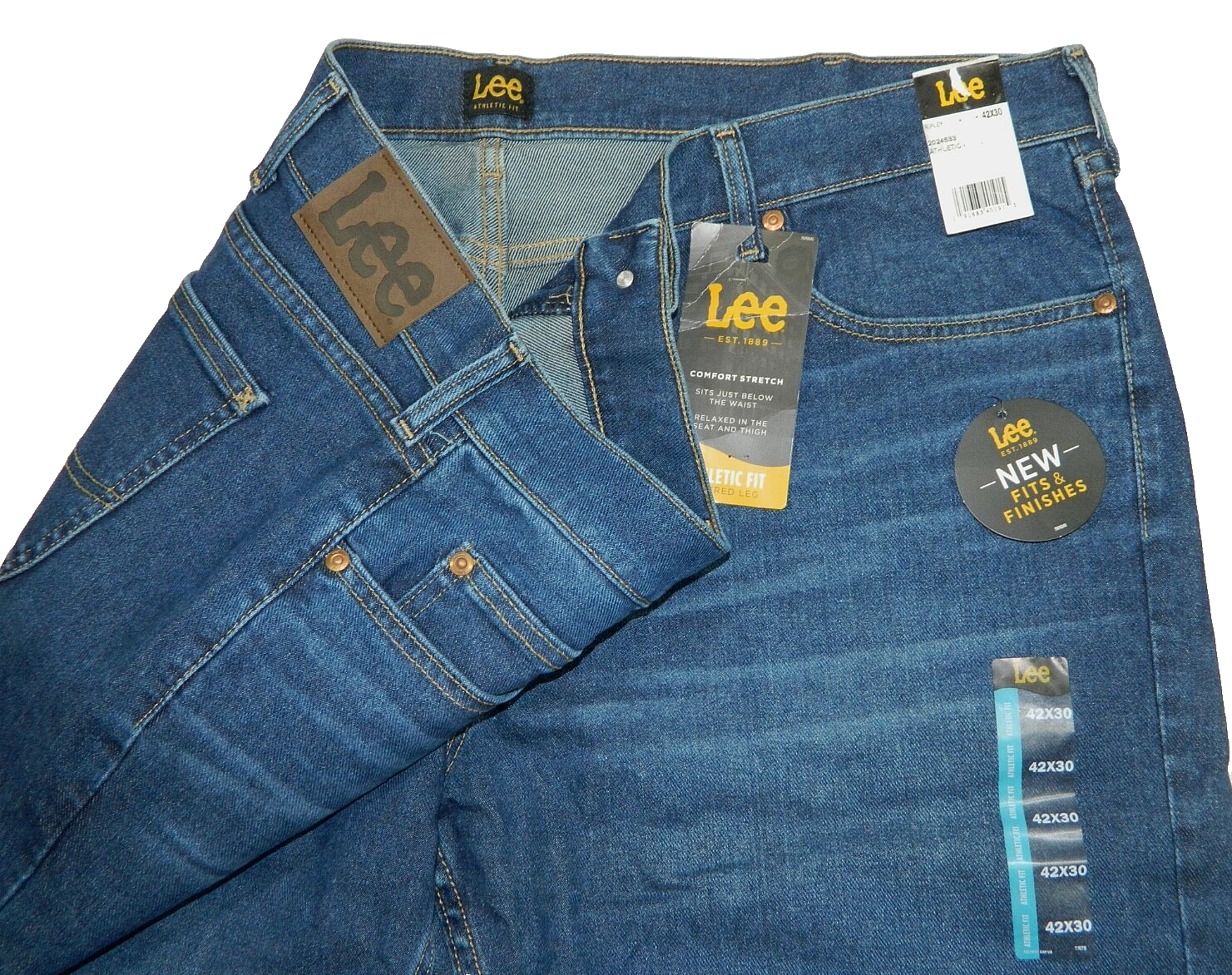 New with Tags pair of Lee Brand Ripley 2024533 Athletic Fit Premium Denim Blue Jeans. Tag Size: 42x30. Almost this size. 99% Cotton 1% Spandex. Waist: 21, Inseam: 29, Front Rise: 12.25, Leg Opening: 8. Worn just below the waist. Store shelf condition. BWO11