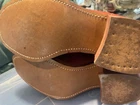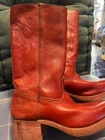 These are men's Levi Vintage Leather Boots in a Saddle Brown color, size 10.5. The boots have a Western style with an upper and outsole made of leather. They are in mint condition.