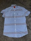 Elevate your wardrobe with this stylish Luke men's shirt in a classic blue and white check pattern. Made from high-quality cotton canvas fabric, this regular fit shirt features short sleeves and a collared neckline with a button-down closure. The shirt is adorned with a subtle logo accent on the chest, adding a touch of sophistication to the overall design. Perfect for any occasion, this shirt is versatile and can be worn for travel, weddings, parties, or even as workwear. The size is Large and the shirt is suitable for men. With its timeless design and quality fabric, this button-up shirt is a must-have addition to any fashion-conscious man's wardrobe. The shirt says size 2 but pit to pit is 23” Note This item is used, so please don’t expect perfection. May have minor faults but generally in good used condition unless stated. Any questions please don’t hesitate to get in touch Thank you as always