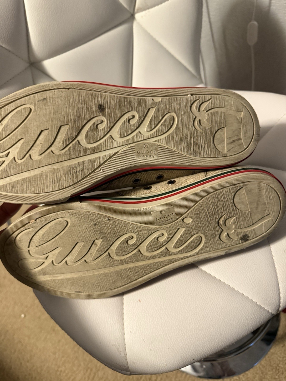 The product is a pair of men's Gucci sneakers in size 10.5, featuring a solid beige color with a leather lining and upper material. The shoes are designed for casual occasions and are part of the Gucci Ace collection, known for their comfort and stylish design. Made in Italy, these sneakers showcase the iconic Gucci logo and are perfect for the fall season.