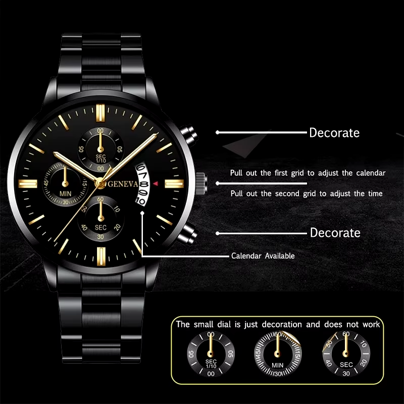 Elegant Men's Stainless Steel Calendar Watch with Luminous Hands & Quartz Precision Upgrade your style and punctuality with this sophisticated men's quartz movement watch, crafted for business and luxury occasions. Combining a durable stainless steel band with a complete calendar and luminous hands, this round case watch is the perfect accessory for the modern gentleman seeking both function and fashion. Key Features ✅ Stainless Steel Band: Robust, stylish, and designed for everyday business or luxury wear. ⭐ Quartz Movement: Reliable and precise timekeeping ensures you stay on schedule. 📅 Complete Calendar: Effortlessly keep track of the date with the integrated calendar display. 💡 Luminous Hands: Easily read the time in low-light conditions, day or night. 🛡️ Hardlex Dial Window: Scratch-resistant surface maintains a clear, pristine look. ⏺️ Round Case Design: Classic, timeless appearance suitable for any occasion. Detailed Overview The men's stainless steel quartz watch is designed for those who value both performance and aesthetics in their timepieces. Its robust stainless steel band not only adds a touch of sophistication, but also ensures lasting durability, making it an ideal choice for business professionals and style-conscious individuals. The bracelet clasp watch design offers security and comfort, ensuring the watch remains securely on your wrist throughout your busy day. At the heart of this men's quartz watch is a high-precision quartz movement , delivering consistently accurate timekeeping so you never miss a meeting or appointment. The calendar watch feature allows you to check the date at a glance, streamlining your daily routine and keeping you organized. For those who work late or enjoy evenings out, the luminous hands watch functionality ensures the time is always visible, even in dim environments. The hardlex dial window offers excellent scratch resistance, protecting the watch face from everyday wear and tear. The round case watch design is timeless and versatile, complementing both formal business attire and casual outfits. Although the subdials and chronograph elements are decorative, they add to the luxury men's watch aesthetic, giving the timepiece a premium, high-end appearance. With a band length of approximately 220mm and a width of 20mm, this business wrist watch is designed to fit comfortably on most wrists. The 41mm case diameter and 9.5mm thickness strike the perfect balance between presence and subtlety, ensuring the watch stands out without being overly bulky. Whether you're in the boardroom or out on the town, this stainless steel watch enhances your look while providing practical features you'll use every day. Please note: The subdials and chronograph are decorative only and do not function. Actual color may vary slightly due to monitor differences. Specifications Feature Detail Movement Quartz Band Material Stainless Steel Dial Window Hardlex Calendar Complete Calendar Display Luminous Hands Yes Band Length Approx. 220mm Band Width Approx. 20mm Case Diameter Approx. 41mm Case Thickness Approx. 9.5mm Subdials/Chronograph Decorative Only (Non-Functional) Product Gallery Shipping Information We deliver to addresses within the United Kingdom. International customers may order through eBay’s Global Shipping Programme, which manages international delivery on our behalf. Orders are typically dispatched within 3 working days following payment verification. In most cases, dispatch occurs within 24 hours unless stock is temporarily unavailable. Standard UK delivery takes 5–10 business days, excluding weekends and public holidays. International delivery times may vary. Free standard shipping is included within the UK unless otherwise stated. Every order comes with a UK-based tracking number from trusted couriers such as Evri or Royal Mail. Please ensure your eBay-registered delivery address is correct before completing your purchase. Payment Details We use eBay's managed payment system. All transactions are securely handled through the eBay platform, and we never request or accept payments outside of eBay. Returns Policy Your satisfaction is important to us. If you are pleased with your purchase, we kindly request positive feedback. Should any issues arise, please contact us immediately through eBay messages, and we will respond promptly. We offer a free return policy within 30 days. Please send us an image of the product, and we will issue or upload a return label free of charge. In the event that your item is lost during transit or arrives damaged, we will promptly replace the item. Express Postage We offer an Express postage option. If you require Express shipping, please contact us prior to payment so we can adjust the postage accordingly. Contact Us If you have any questions about our products or your order, please message us via eBay. We usually respond in less than 24 hours, Monday to Friday.