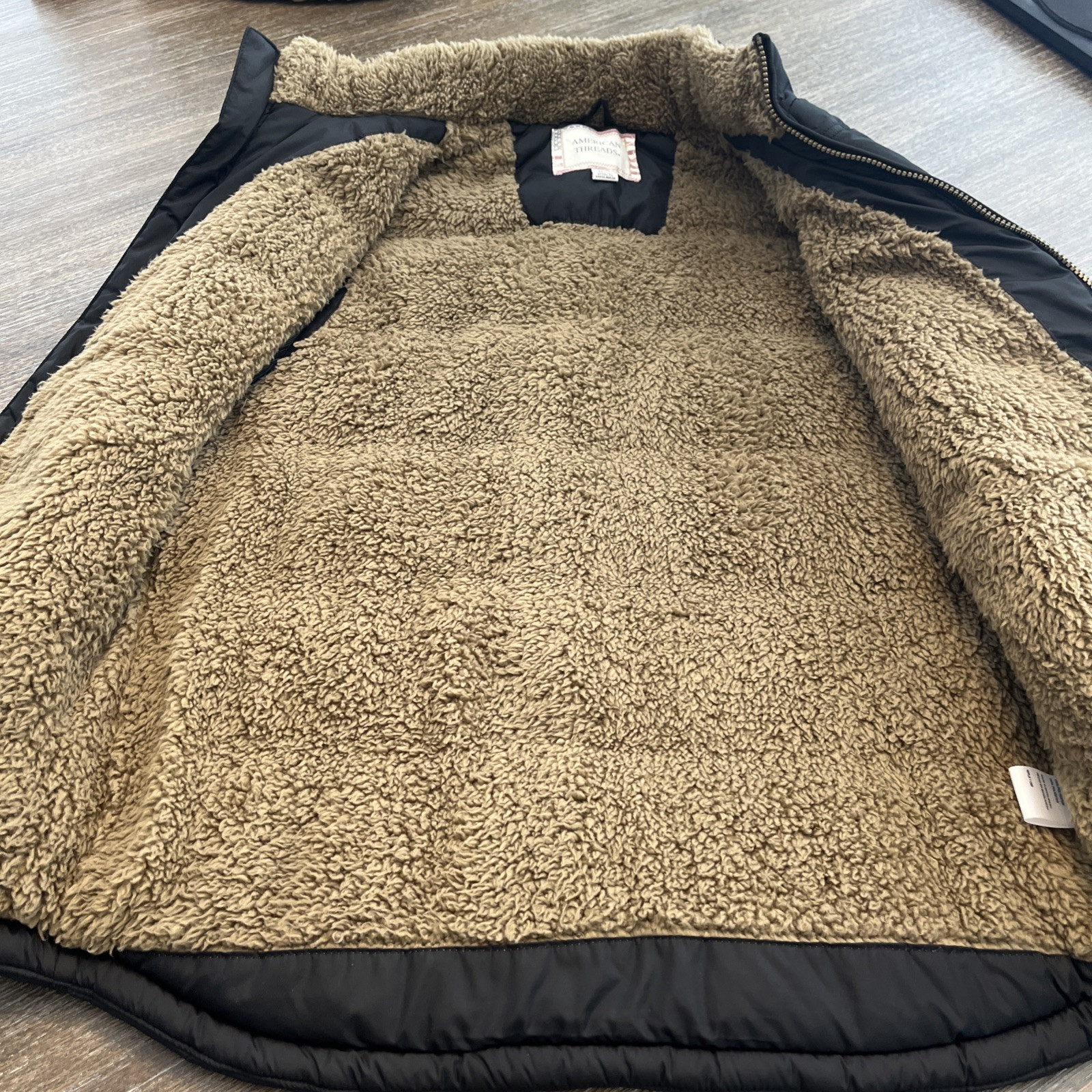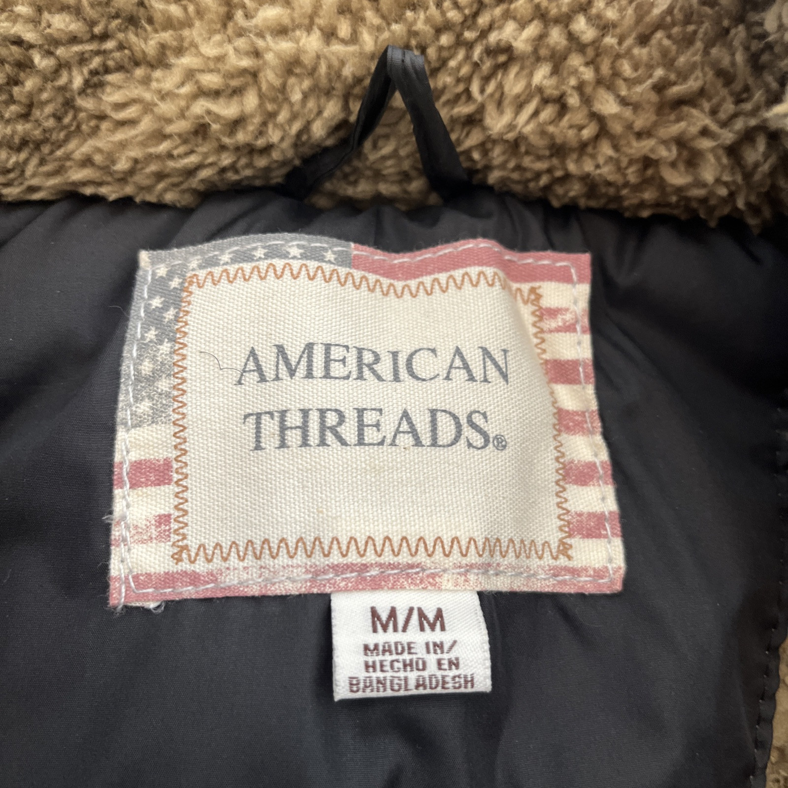 This American Threads puffer vest for men is made of polyester with a fleece lining, featuring a zip closure and stand-up collar. It is a size medium in black, suitable for casual wear in winter and fall. The vest has a solid pattern, is machine washable, and offers warmth and comfort for activities like walking and hiking.