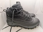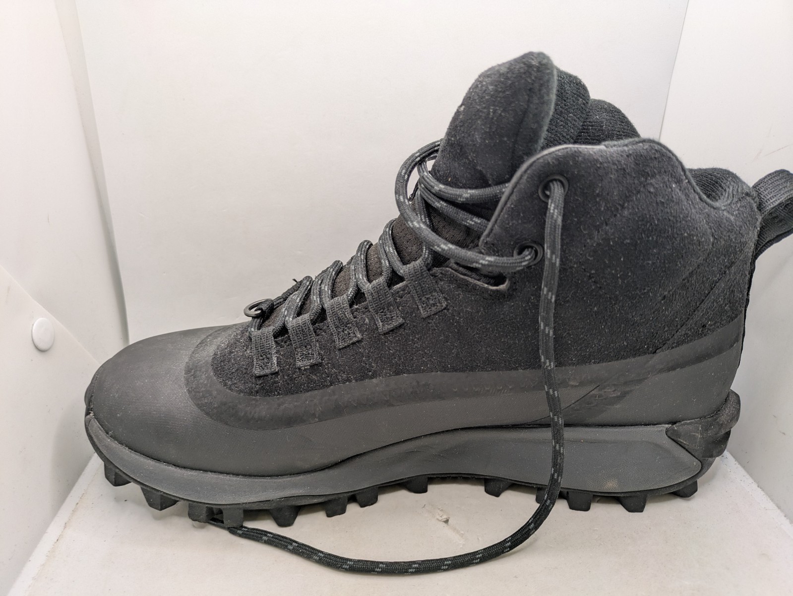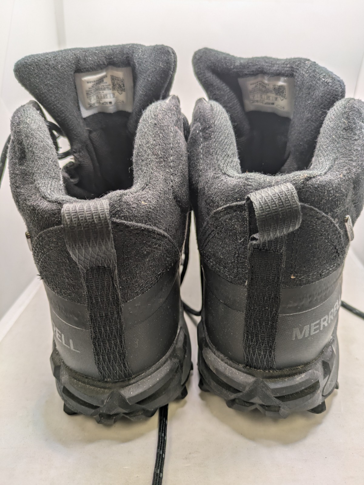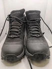 The product is a pair of Merrell men's hiking high tops in size 8 US (UK size 7.5). These black sneakers feature a lace-up closure, solid pattern, and waterproof design, making them suitable for various outdoor activities. With Dr. Scholl's inserts, these shoes provide comfort and support for hiking adventures in all seasons. The Merrell brand is known for quality athletic footwear, and these shoes are designed for performance and activity in rugged terrains.