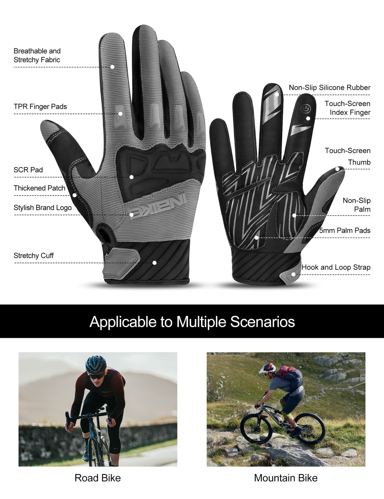 [Knuckles Protection]: The environmentally friendly SCR and TPR rubber on the back of bicycle gloves, will protect knuckles from injury when encounter friction or collision. Covering rubber only in critical areas makes the gloves more breathable. [Wear-resistant/Non-slip/Shock-resistant]: The 5MM palm pads will effectively absorb shock, reduce pain and numbness, and non-slip silicone strips on it, make riding easier. [Comfortable and Breathable]: The high-stretch and breathable fabric used in the back of this cycling gloves, will give you a good hand wrapping feeling, and the mesh will keep hands fresh and comfortable in hot weather. The microfiber fabric in palm is more durable than regular fabrics, extending the life of the glove. [Touch Screen Design]: This dirt bike glove can touch the screen with your index finger and thumb, allowing you to use your mobile device flexibly without taking off the glove. Additional, Hoop and loop strap allow for easy glove removal. [After-sales Service]: If you have any problems, please feel free to contact us, we will provide you with refund and replacement services.