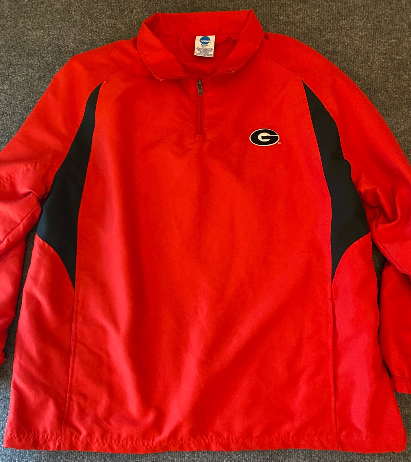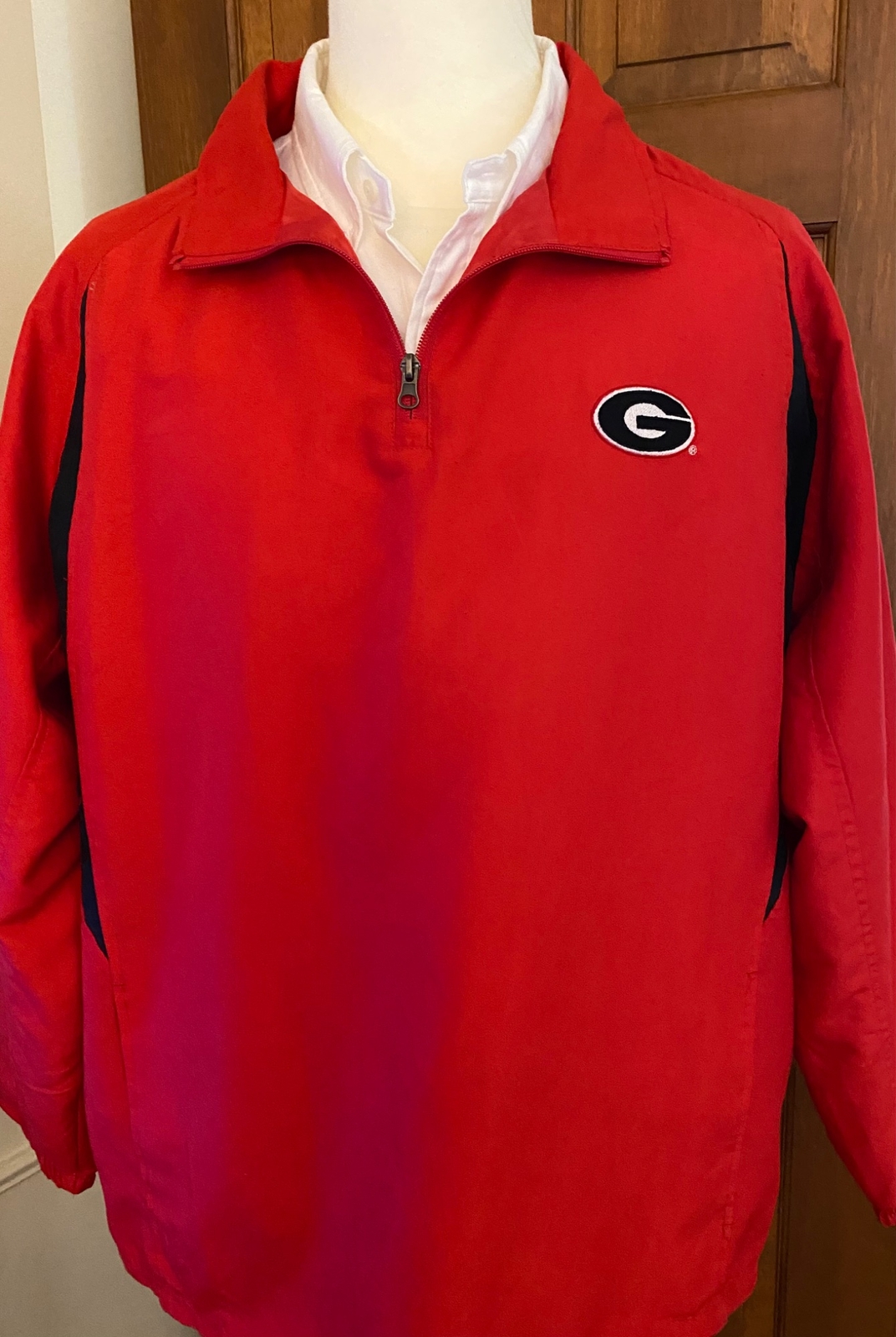 Official NCAA Georgia Bulldogs men's rain jacket. This 1/4 zip pullover is perfect for game day, keeping you dry and showing your team spirit. SEC football-themed, size large. • Official NCAA merchandise • Georgia Bulldogs pride • 1/4 zip pullover • Game day ready • SEC football