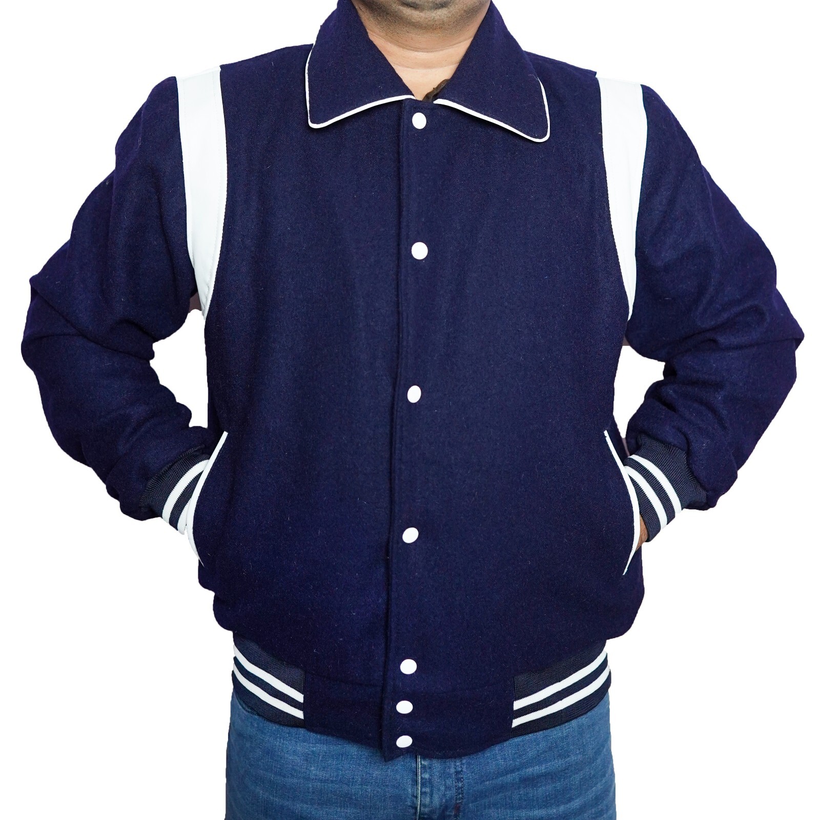 Men's Letterman Moto Biker Bomber Baseball Sports Navy Blue Wool Varsity Jacket Product Descriptions: Material: 100% Wool (White Leather Stripes) Internal: Soft Skin Friendly Polyester Lining Colour: Navy Blue Style: Varsity Jacket Front: Snap-Tab Buttoned Closure Front Collar: Shirt Style Collar Cuffs: Rib-Knitted Cuffs Hemline: Rib-Knitted Hemline Pockets: Two Pockets Inside & Two Pockets Outside Stitching: Excellent Quality Care: Dry Clean / Hand Wash / Machine Wash