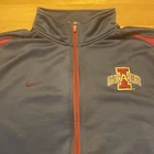 The product is a men's Nike Dri Fit Iowa State Cyclones full zip jacket in size XL. This officially licensed jacket is designed in gray with the Iowa State Cyclones team logo, making it perfect for fans of the team. This is a pre owned jacket please look over pictures and measurements