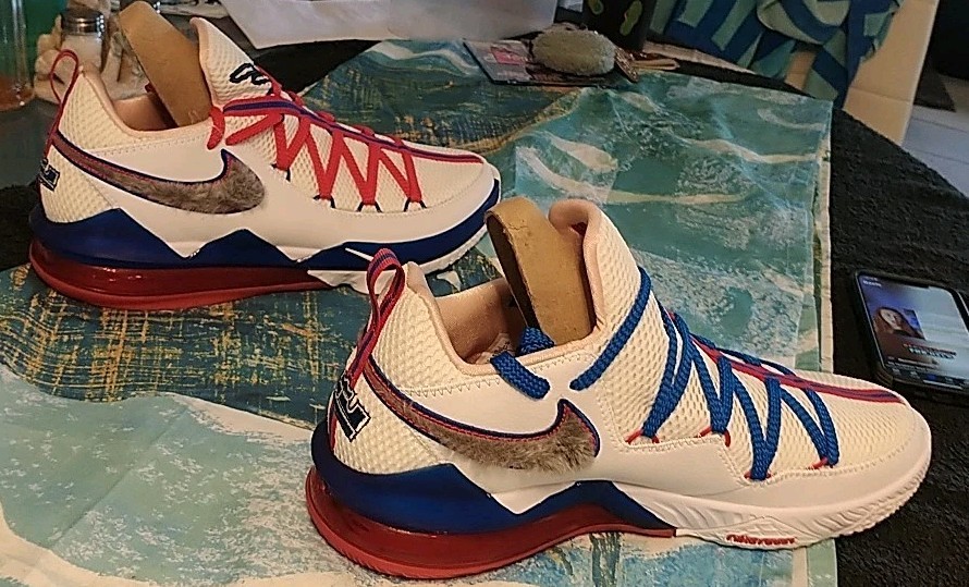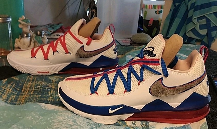 The Men's Nike LeBron XVII Low Tune Squad Red White Shoes CD5007-100 in size 11 are a stylish and comfortable pair of sneakers perfect for activewear or casual occasions. With a low top shoe shaft style and lace-up closure, these shoes are designed for maximum comfort and breathability. The multicolor design features the iconic Nike LeBron James product line and Tune Squad theme, while the synthetic upper material and foam insole provide durability and support for various activities such as basketball, cross-training, and everyday wear. Made in Vietnam in 2019, these shoes are a must-have for any fan of Nike and LeBron James.