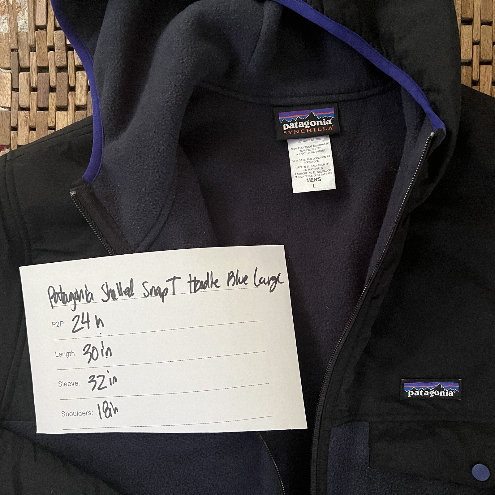 Stay warm and stylish with this Patagonia Shelled Synchilla Snap-T Fleece Hoody. This jacket is perfect for outdoor activities such as skiing, hiking, or simply going for a walk. The hoodie features a solid blue/black color block with accents of a zipper and logo, making it a fashionable choice for any occasion.