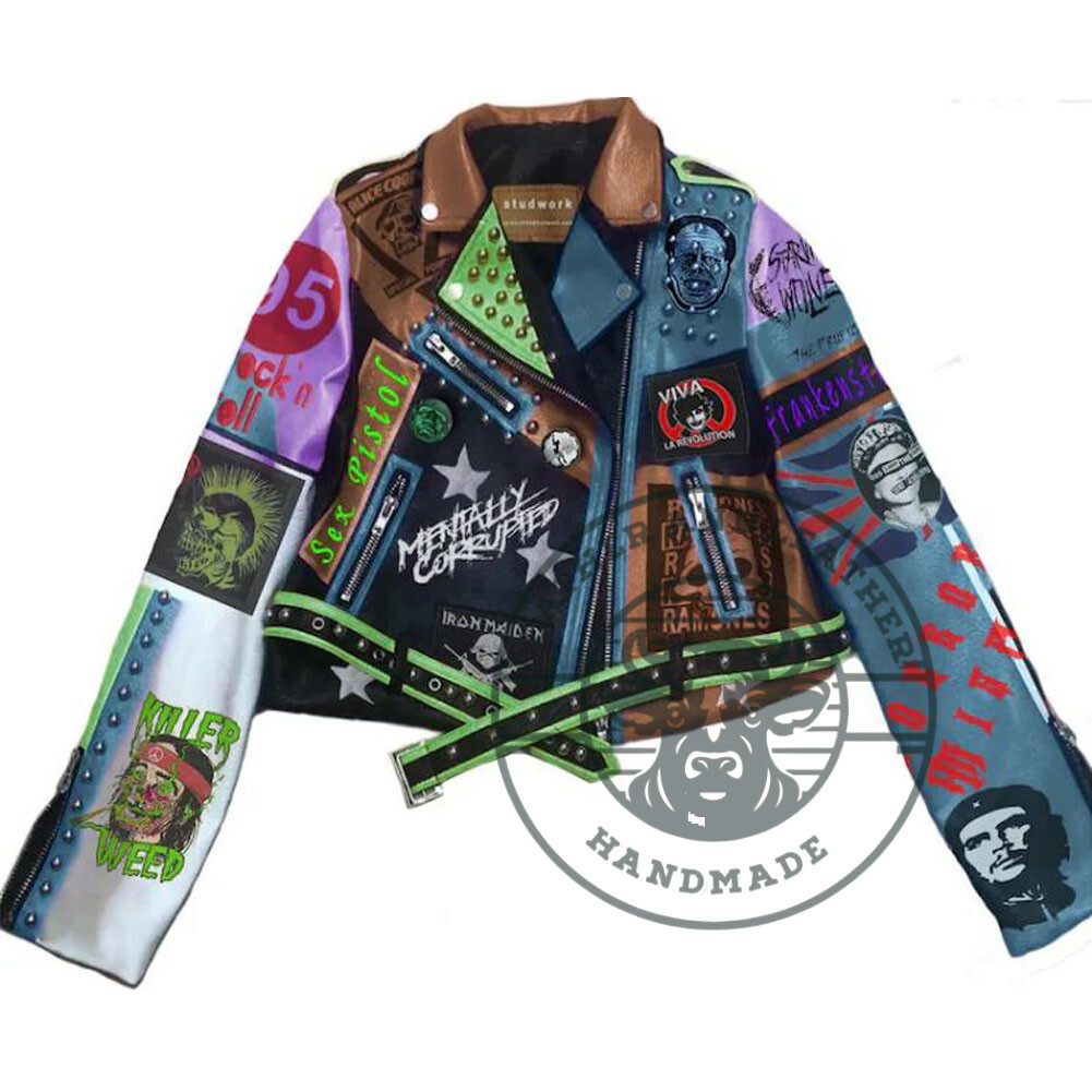 Punk Rock Multicolor Studded Gothic Pyramid Patchwork Leather Jacket