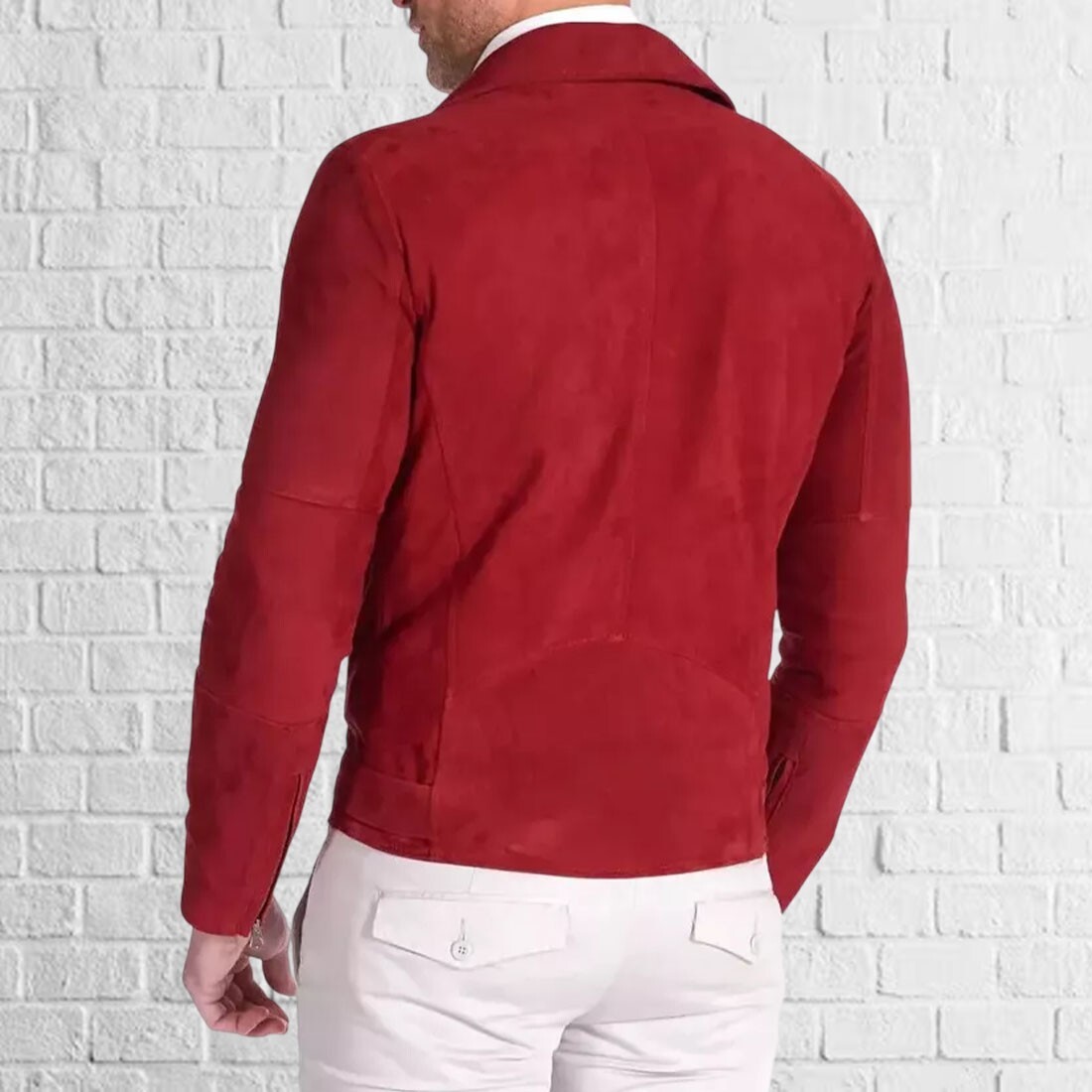 This jacket is absolutely stunning! The rich red suede looks and feels luxurious, and the fit is spot-on—just make sure to check the size guide. The biker style gives it an edgy yet classic vibe, while the warm lining keeps you cozy in colder weather. The zipper is smooth, and the pockets are super handy. Perfect for making a bold fashion statement while staying comfortable. Definitely a must-have for anyone who loves standout outerwear!