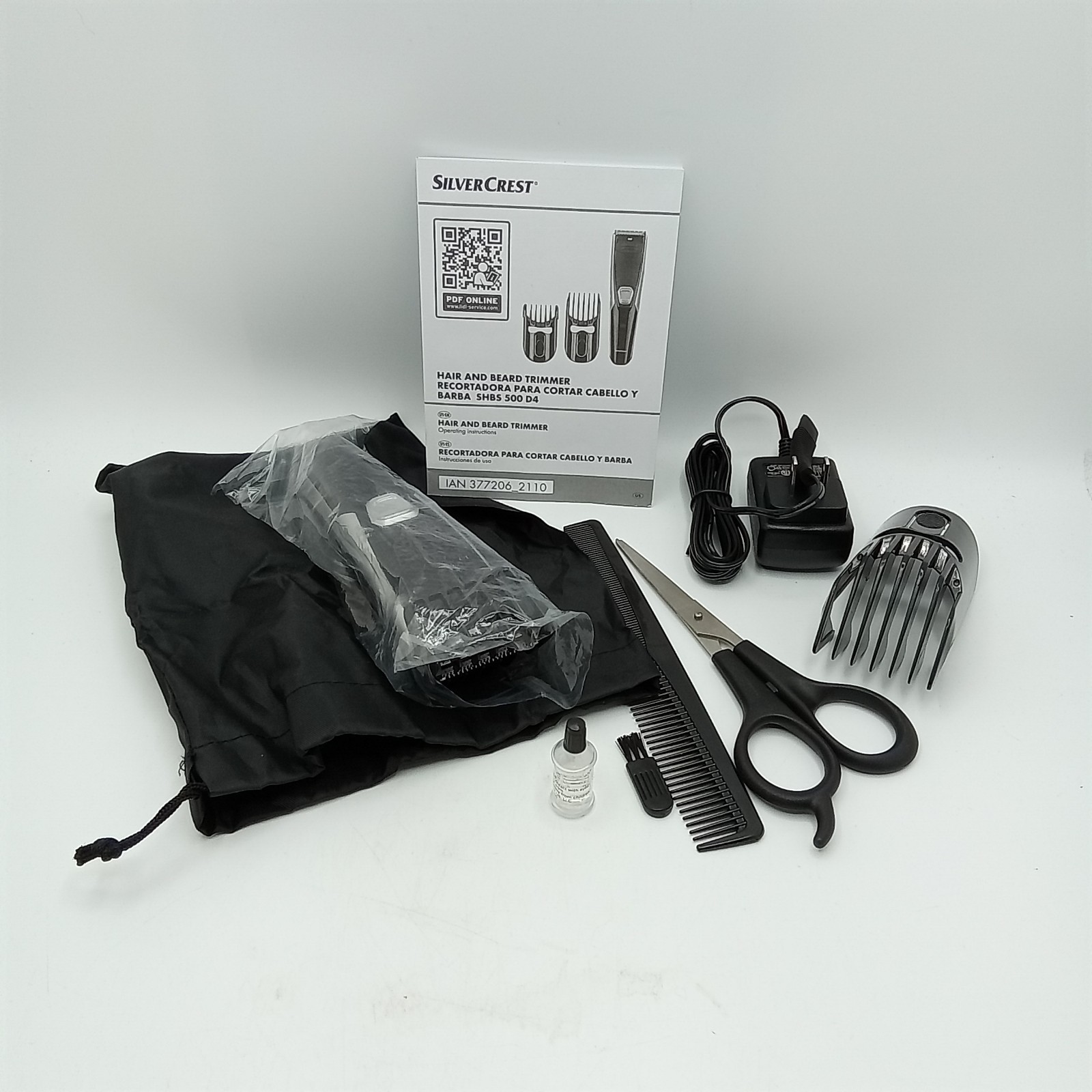 New in Box. Silver Crest Hair & Beard Trimmer for Men. Features: 2 adjustable comb attachments, LED display, stainless steel blade, run time is 60 mins, and charging time is 90 min. Included in box: 2 adjustable comb attachments, scissors, comb, storage bags, cleaning brush, blade oil, and power adapter. Great for home and travel. C2 SHELF