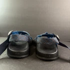 The product is a pair of Men’s Chaco adjustable sandals in size 9, featuring a blue and orange pattern. These sporty casual sandals are designed for hiking and other outdoor activities, with an adjustable fit for added comfort. The synthetic upper material and slip-on style make them durable and easy to wear for various occasions. Ideal for men who enjoy blending style and functionality in their footwear.