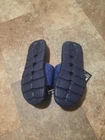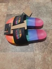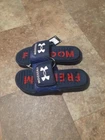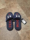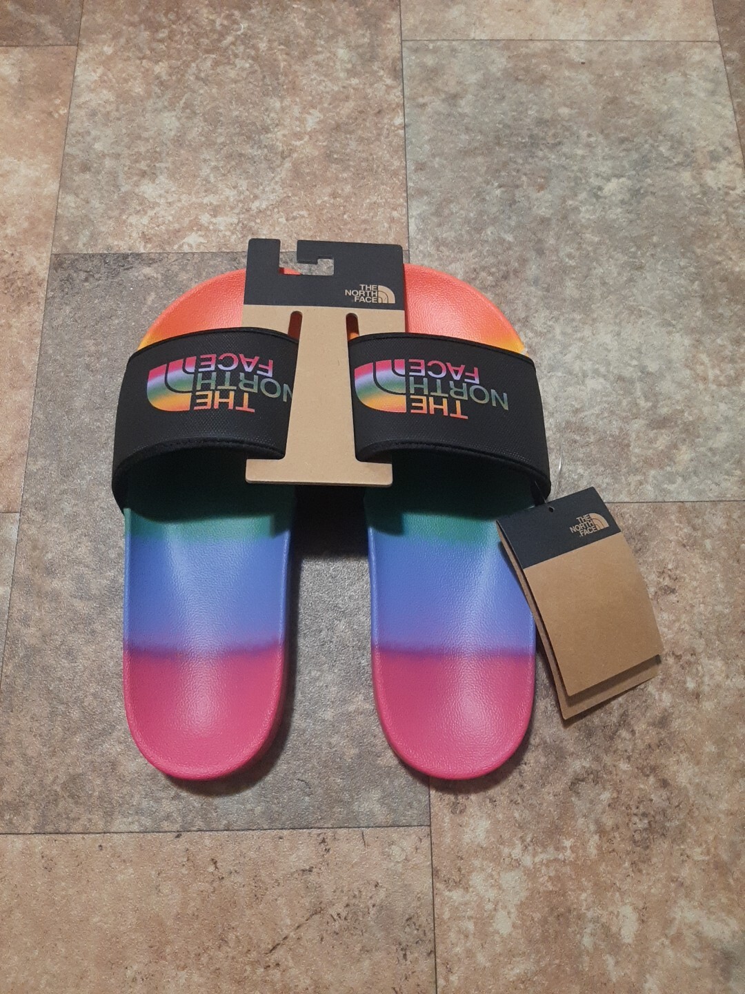 Elevate your style and comfort with this limited edition bundle of 3 pairs of men's slides, size 10. The striped pattern and multicolor design make these sandals perfect for any occasion, whether it's for travel, activewear, party/cocktail, casual, formal, workwear, or business. The cushioned, lightweight, and adjustable features of these slides make them perfect for any season, including winter, summer, fall, and spring. The outsole material is made of fabric and the insole material is made of rubber. These slides are vintage and belong to the Under Armour and Adidas product lines. The North Face character and the Under Armour theme add to the style of these slides. Get ready to slip into comfort with these stylish slides that are perfect for any occasion.