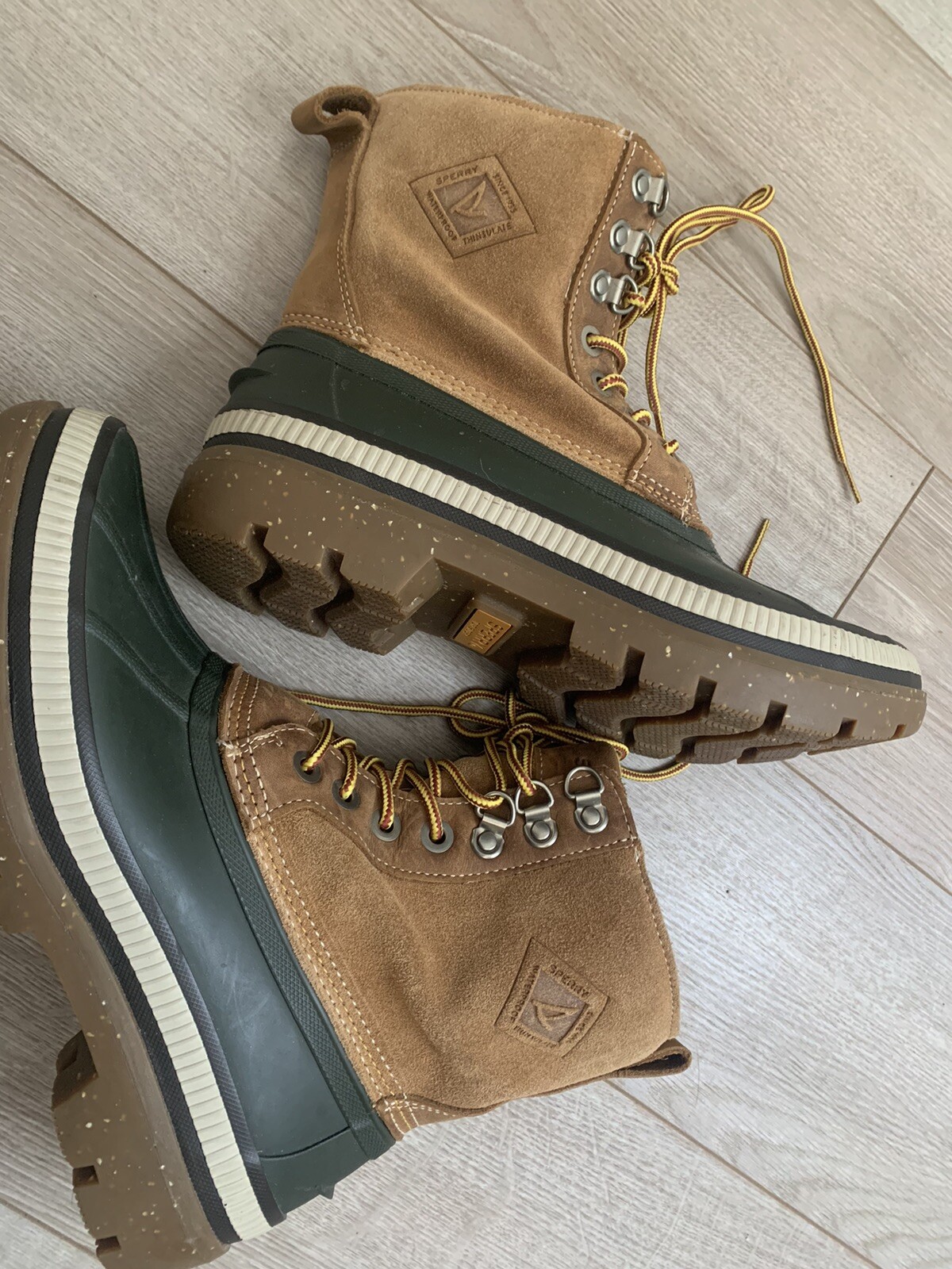 Keep your feet warm and dry with these Sperry Tall Insulated Duck Boots in a stylish brown color. Made with high-quality leather and featuring an insulated design, these boots are perfect for winter activities. The boots are designed for men's US shoe size 8 and have a snow boot style that is both fashionable and functional. The Sperry Tall model is a great addition to any wardrobe, especially for those who love the outdoors. The boots have a durable construction that can withstand harsh weather conditions, making them perfect for winter hikes, snowshoeing, or just walking around town. Get your hands on these boots today and stay warm and dry all winter long!