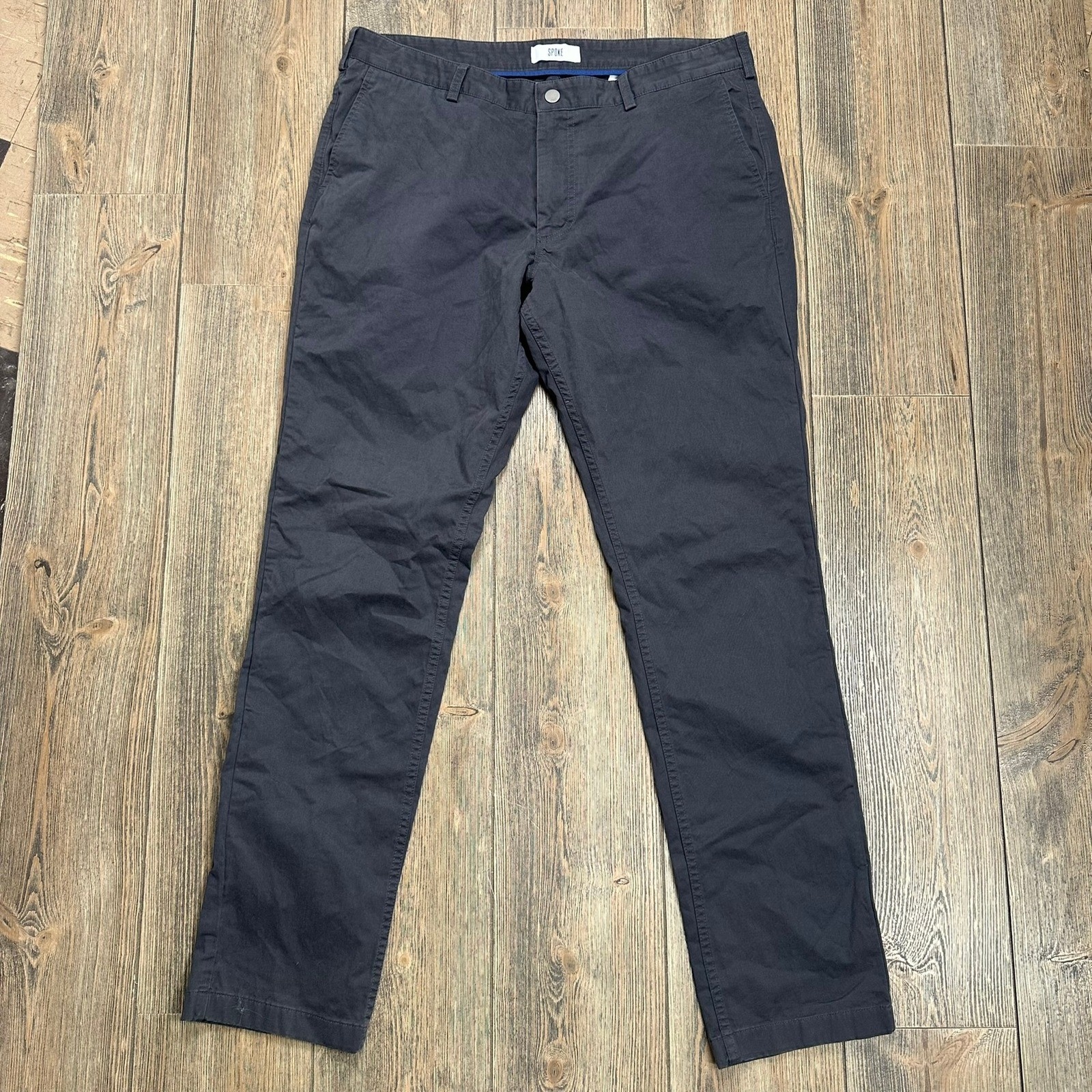 Spoke Heroes Slim Fit Chinos Mens 37x32.5 Build B Gray Cotton Blend Casual Pants Trousers. Good used condition! Enter effortless style with these Spoke Heroes chinos, where comfort meets contemporary design. Notice the refined gray hue, ideal for pairing with both casual tees and crisp button-downs. These trousers showcase a streamlined silhouette with a classic five-pocket design, ensuring both functionality and a modern edge. The thoughtful construction includes subtle details like the secure button closure and durable belt loops, promising a perfect fit and long-lasting wear. Envision these chinos becoming a staple in your wardrobe, perfect for weekend brunches, casual office settings, or a laid-back evening out with friends. Measurements: • Waist: 37 inches • Inseam: 32.5 inches