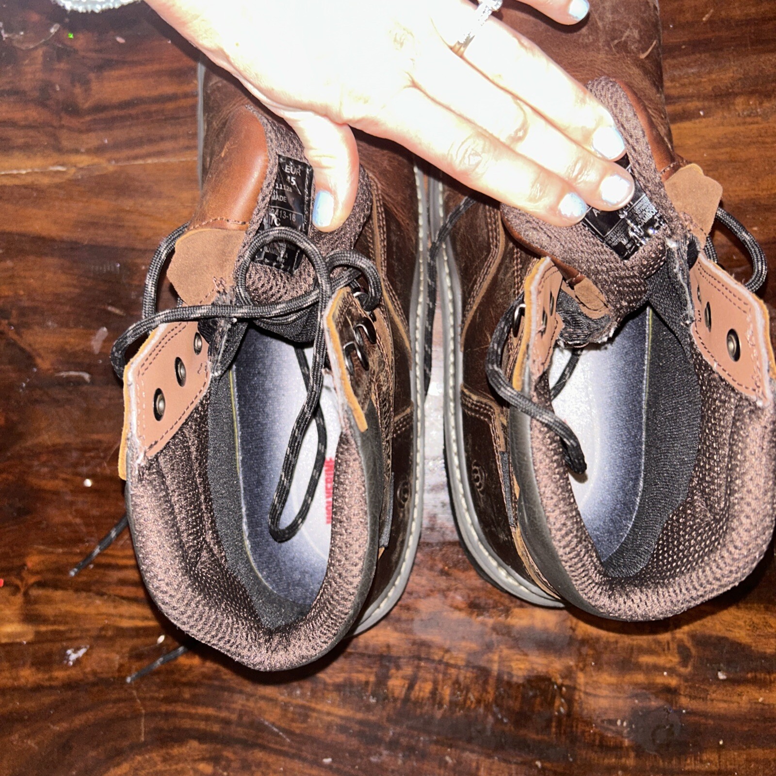 The product is a pair of men's work boots in size 12 with a wide width (EW), featuring a steel toe for added protection in hazardous work environments. The boots are designed in a brown color with a bootie style, ideal for providing ankle support and comfort during long hours of work. Made with leather upper material, these Wolverines brand boots are durable and suitable for demanding work conditions. As is! No refunds