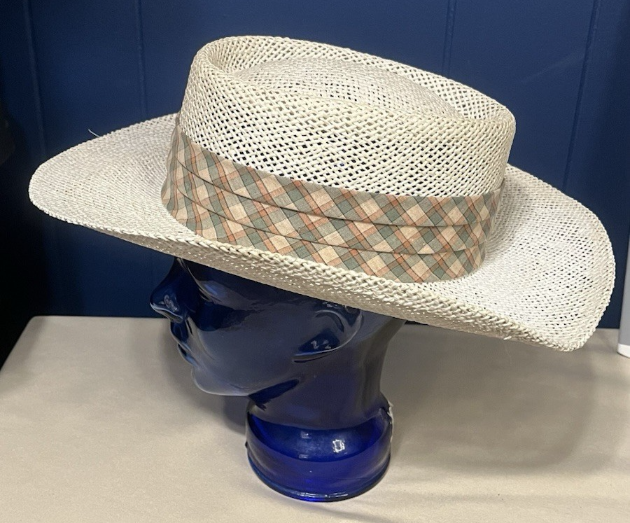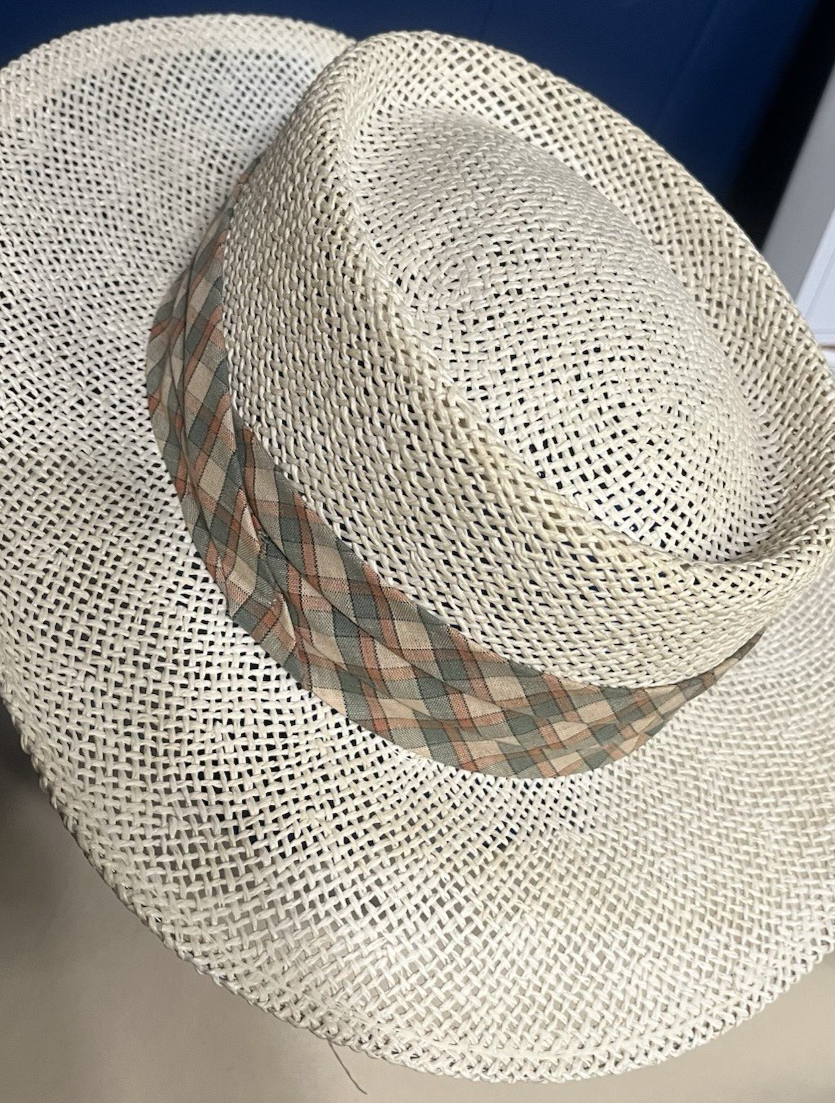 The Men's Straw Gambler Hat is a classic golf sun hat made in the USA with a pleated plaid band. This lightweight and breathable hat is perfect for casual, travel, or workwear occasions during the summer, fall, or spring seasons. The beige, green, orange, and tan plaid pattern adds a stylish touch to this one-size-fits-all hat. Made from twill fabric, this gambler hat is a versatile accessory for men looking for a comfortable and fashionable headwear option.