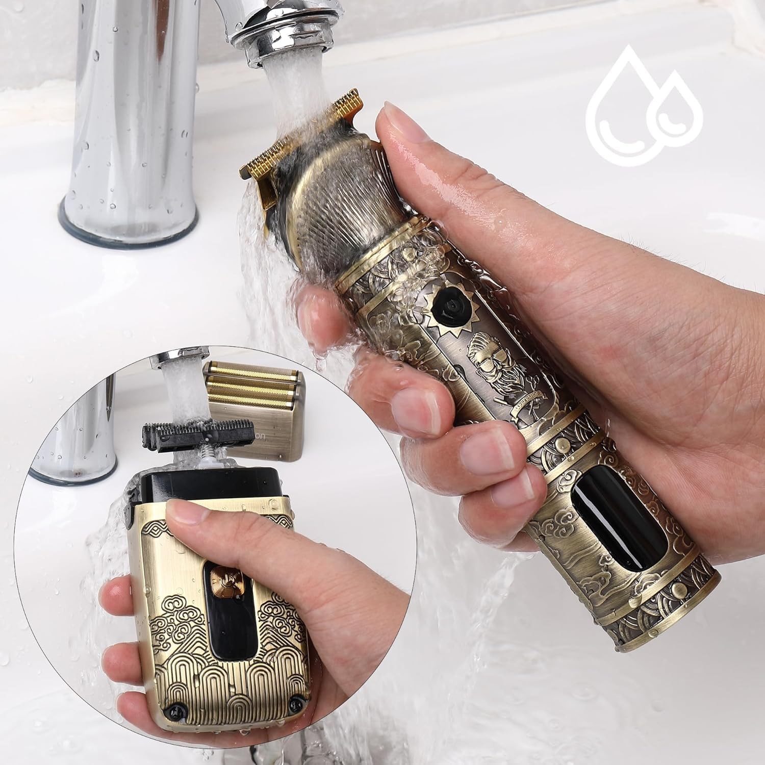 T-Blade Hair Trimmers & Electric Shavers for Men Foil Shaver Beard Trimmer Men's Grooming Kit with Triple Blades Cordless 2 IN 1 Trimmer Kit : Professional hair Trimmer with foil shaver set is a nice choice for home users and barbers to use.Both are awesome and the foil shaver can clean quickly,hair Trimmers are practical and can meet the needs of shaving hair, beard and other body hair. Powerful Motor : Hair clippers and razors are powered by a high-performance motor. With 7500RPM and sharp blade, our machines can easily handle even the thickest and coarsest hair. Plus, our metal construction adds a touch of luxury and durability to your grooming experience. LED Display&Travel Lock:Both the electric shaver and hair trimmer come with smart LCD displays, featuring a one-touch switch and clearly displaying battery percentage, cleaning reminders, and travel lock symbols for added convenience. IPX7 waterproof design allows for easy cleaning and maintenance. Protable & Long-Lasting: With a built-in rechargeable battery, Charge for just 1.5 hours and get up to 180 minutes of cordless runtime. our grooming kit is easy to take with you wherever you go Use Easily: Whether shaving your head, trimming your beard, shaping your sideburns, or grooming your chest hair, this hair trimmer &foil shaver set delivers an exceptional experience.