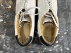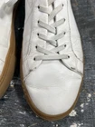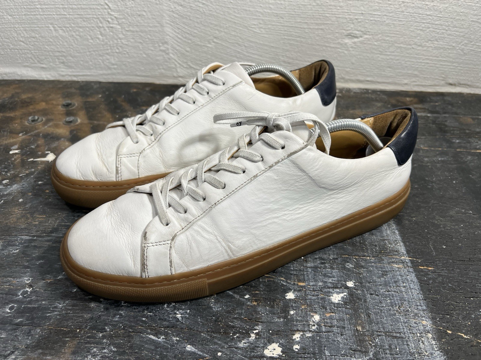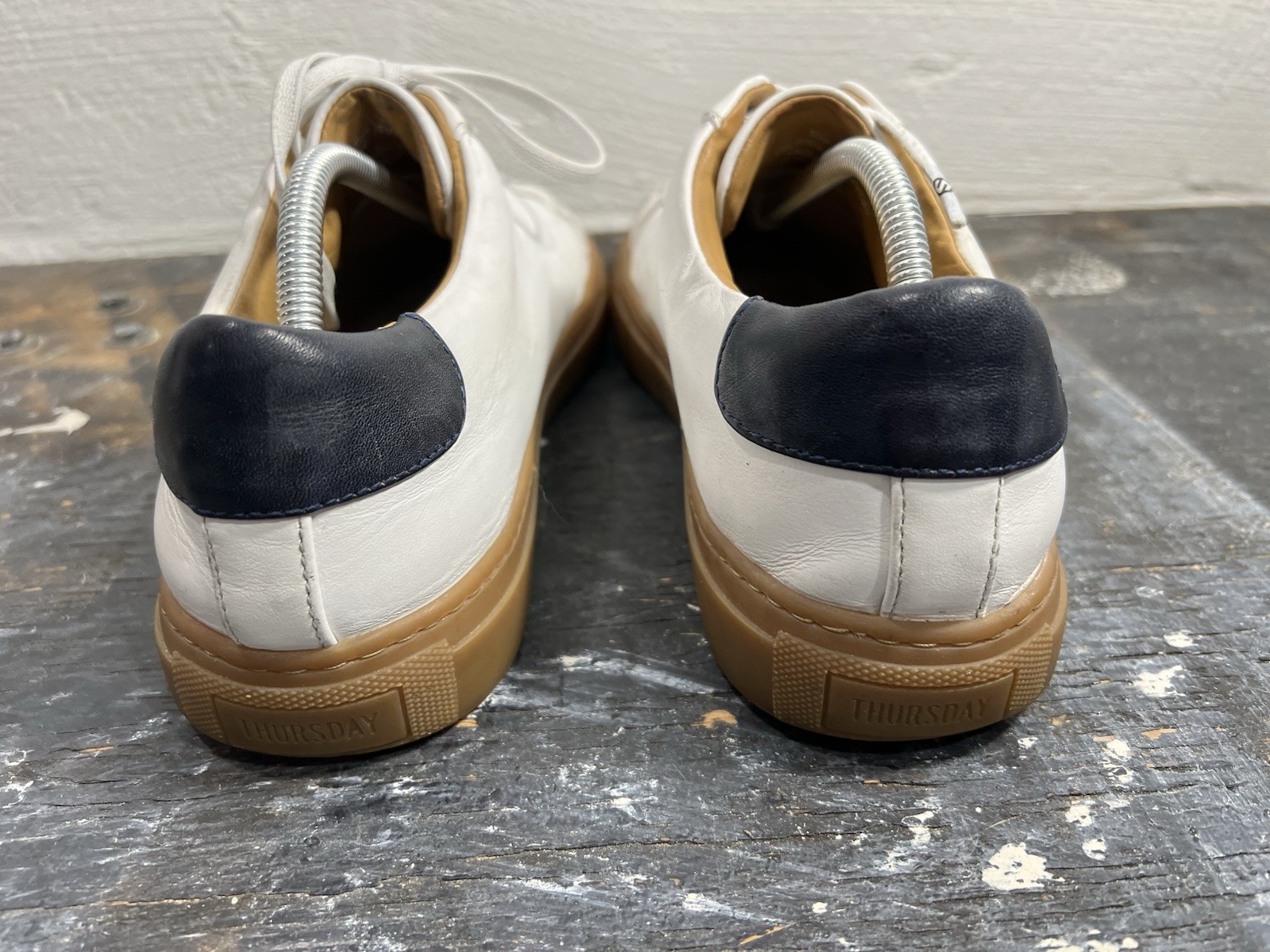 No insoles. The Thursday Boot Co Everyday Premier Low Shoe is a men's white sneaker in size 11.5 with gum soles. Made in Portugal, these casual sneakers feature a solid pattern, lace-up closure, and leather lining material for comfort. The rubber outsole provides durability and a standard shoe width ensures a comfortable fit. With a classic sneaker style and high-quality materials, these shoes are perfect for everyday wear and casual occasions.